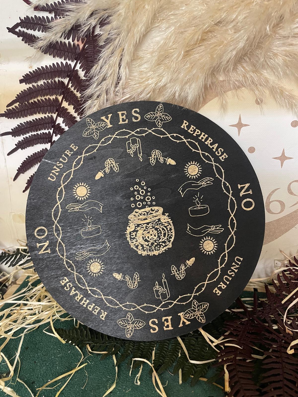 Esta base circular está fabricada en madera de alta calidad y decorada con símbolos esotéricos grabados sobre fondo negro, lo que potencia la concentración, el enfoque y la conexión con la energía sutil.