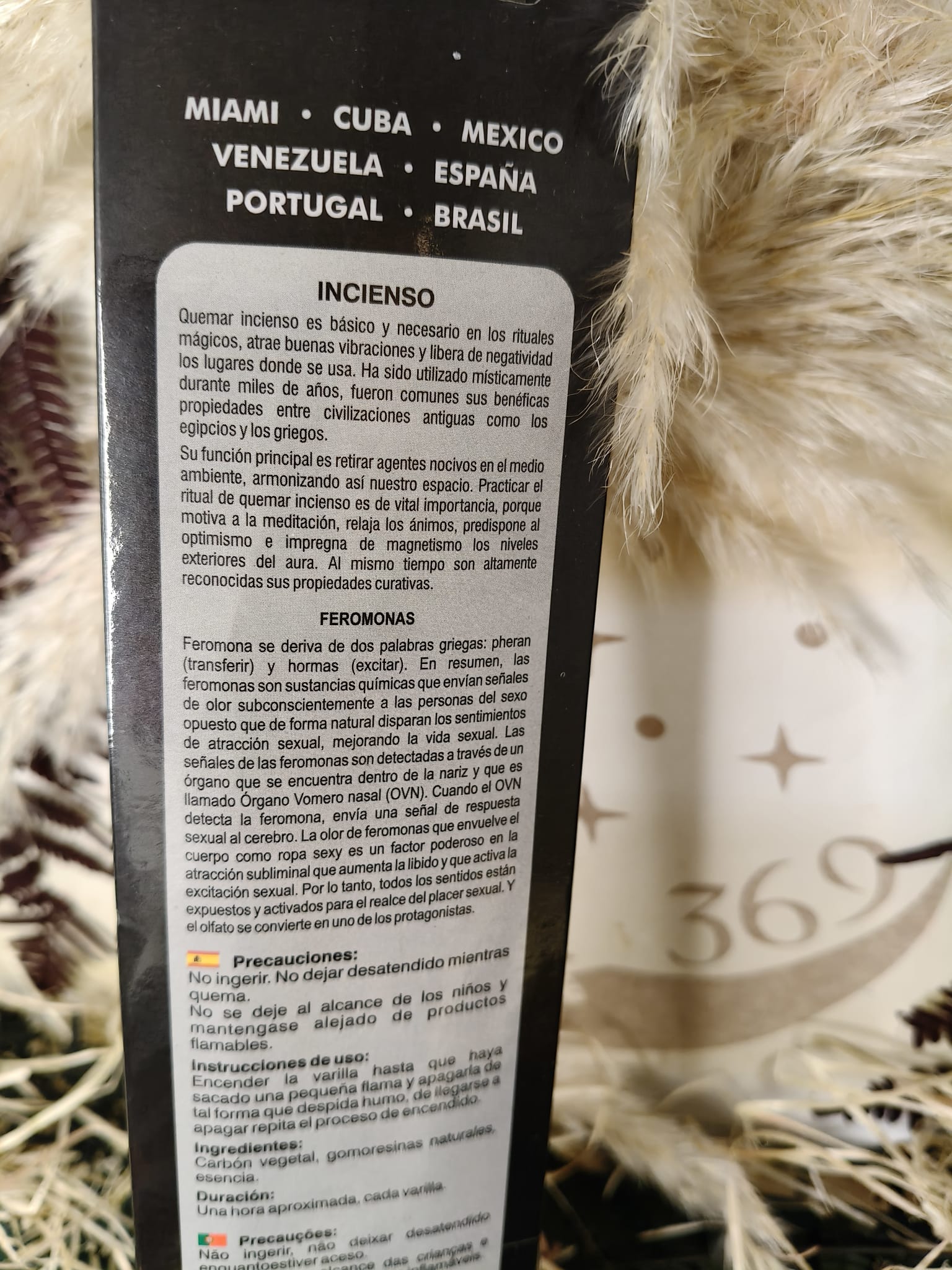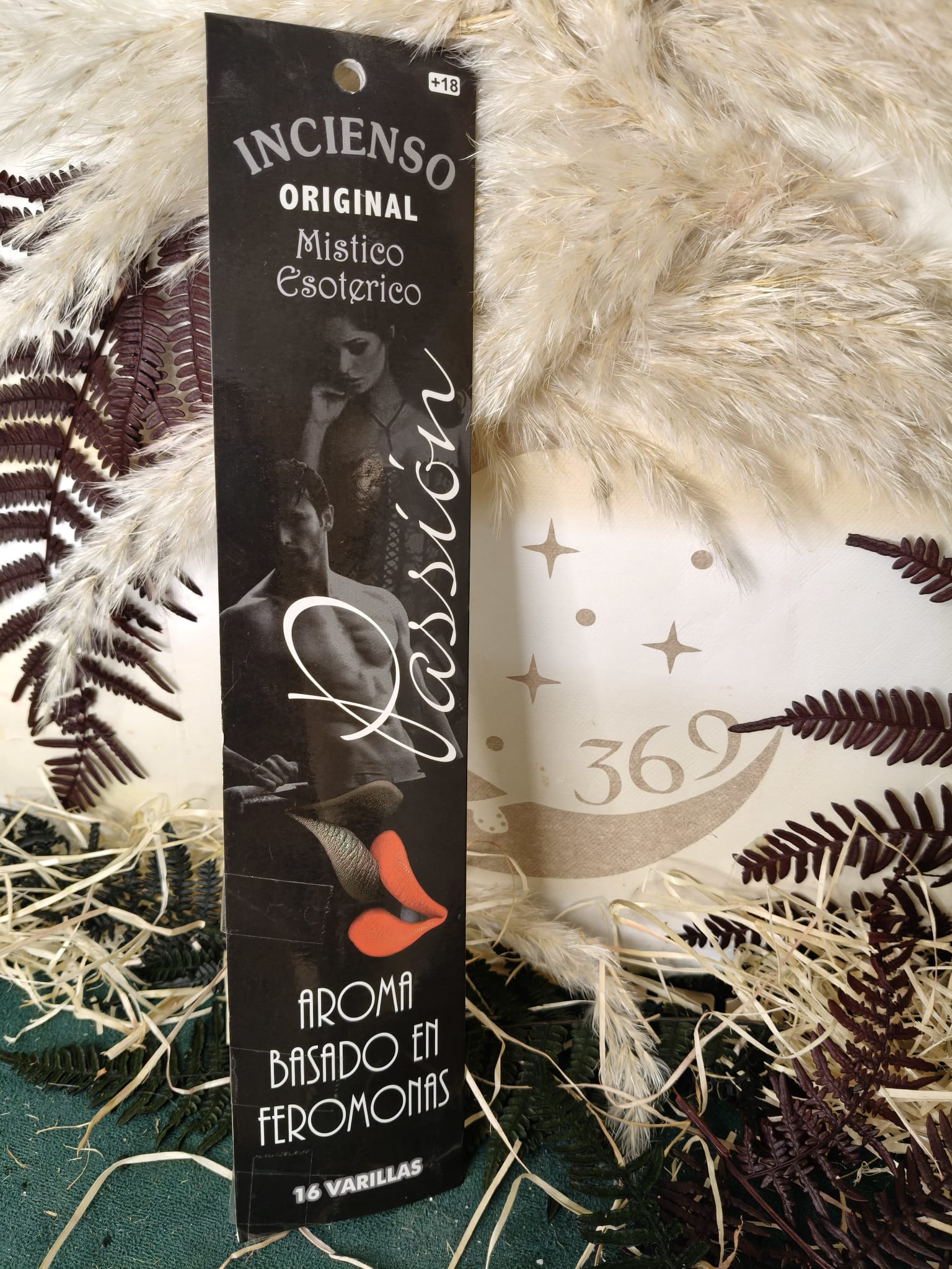 Atracción, Deseo y Conexión Sensorial. Incienso de Pasión con feromonas, elaborado para potenciar la atracción, el deseo y la conexión sensorial, creando un ambiente cálido, sugestivo y envolvente.