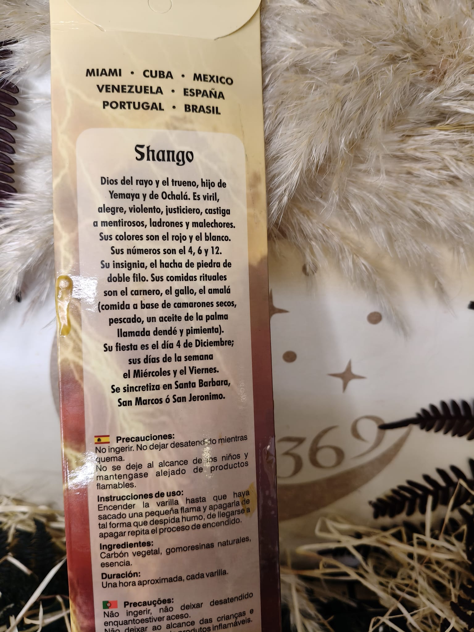 El estuche incluye una breve historia sobre Shangó, donde se detallan sus días propicios y otros aspectos simbólicos, facilitando una conexión más consciente con su energía durante el uso del incienso.
