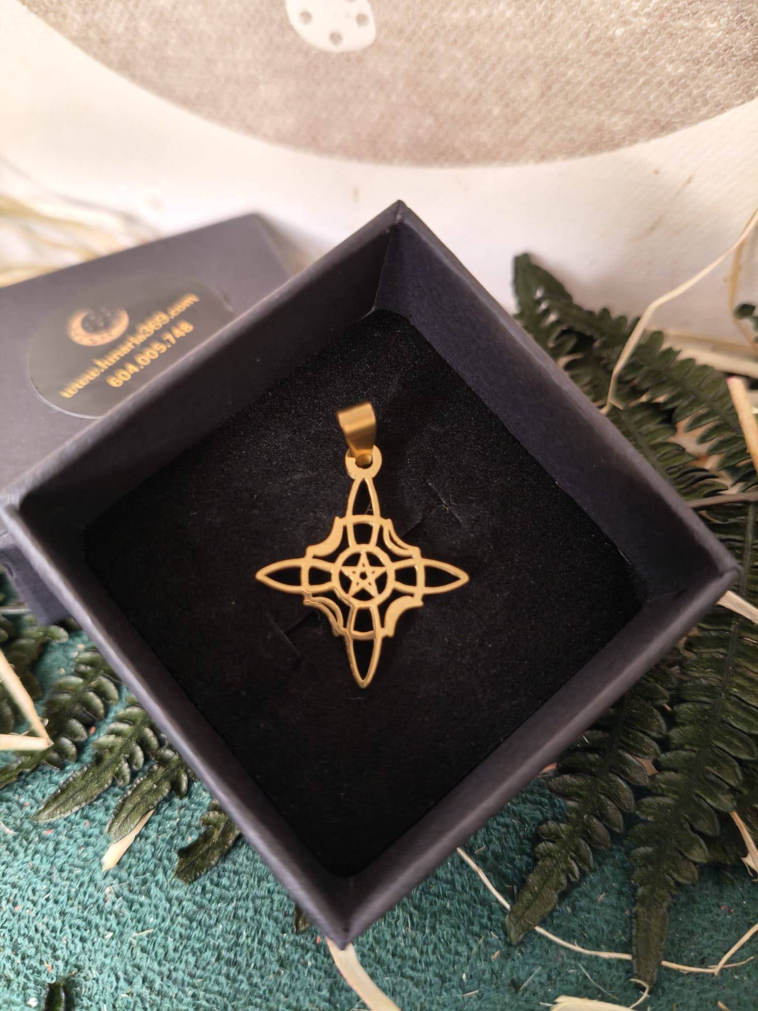 el Nudo de Bruja, utilizado tradicionalmente para la protección continua y el bloqueo de energías negativas, y el Pentáculo, símbolo sagrado de la conexión con los cinco elementos y el equilibrio del espíritu.