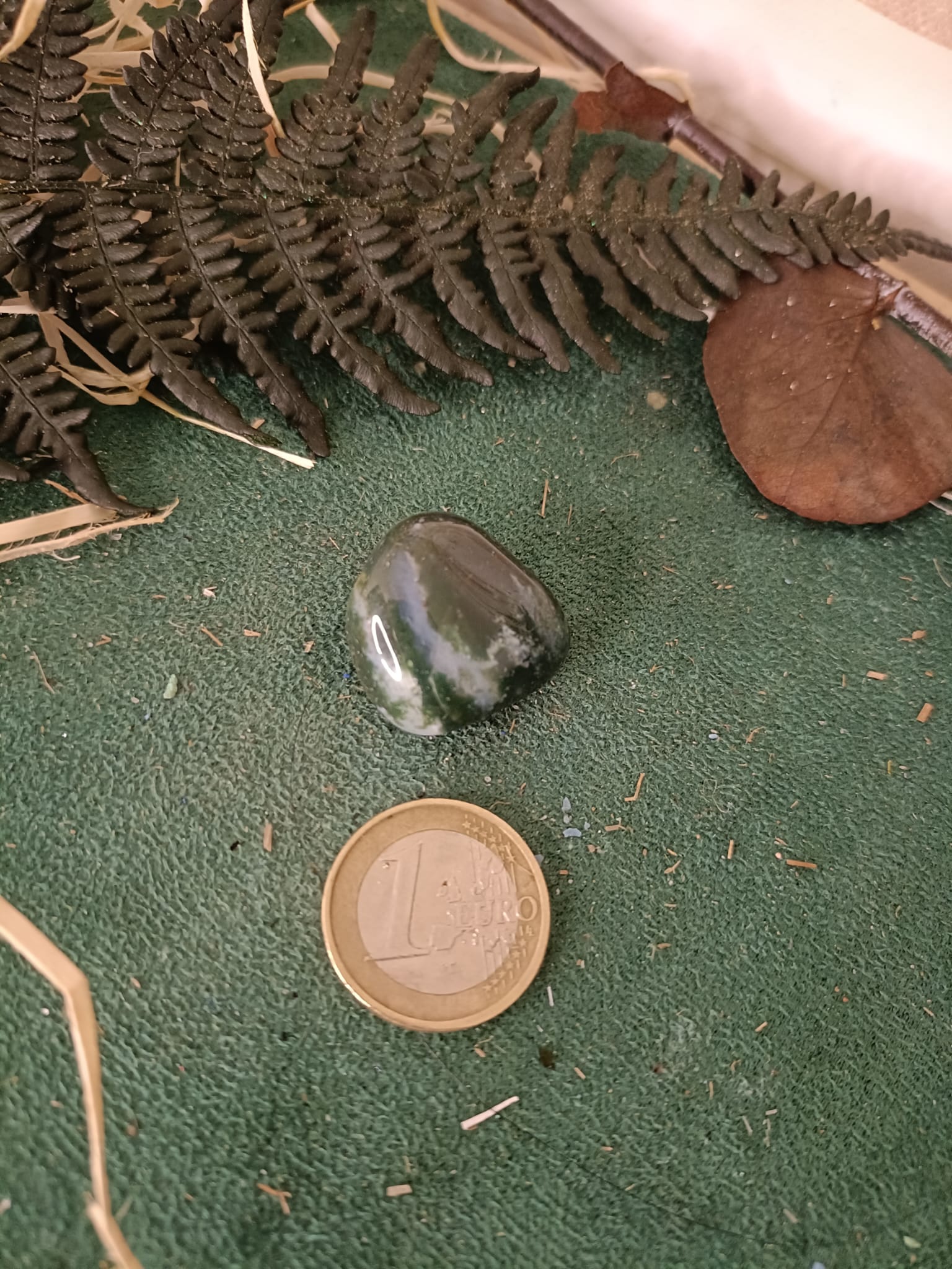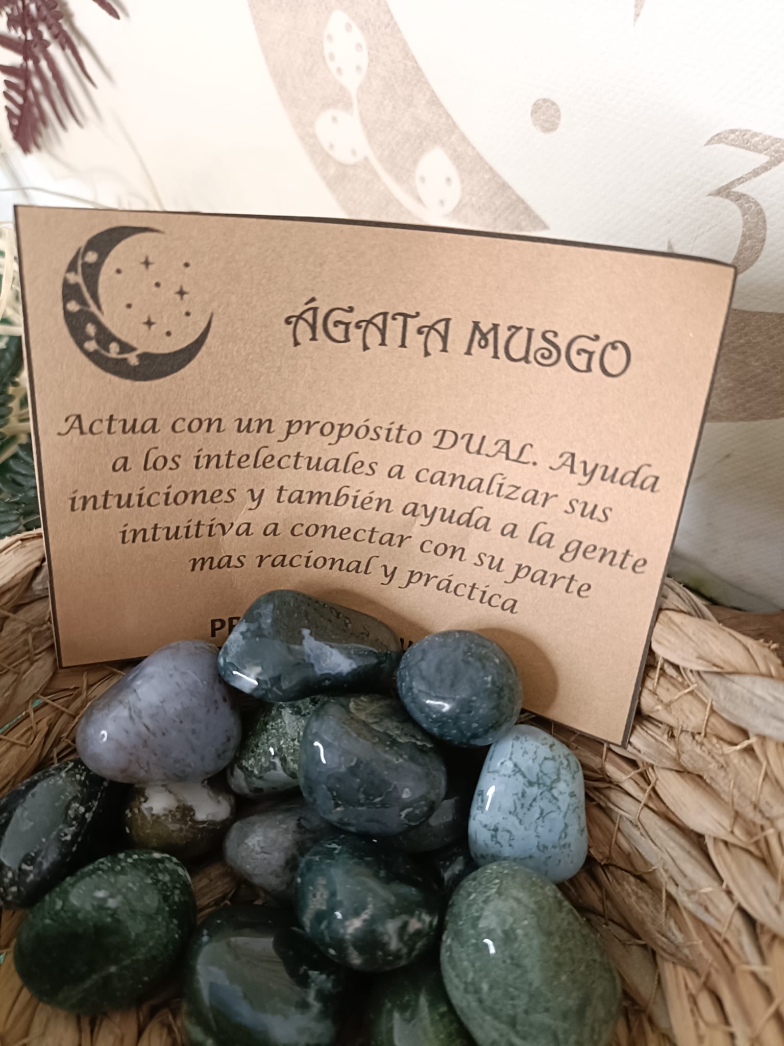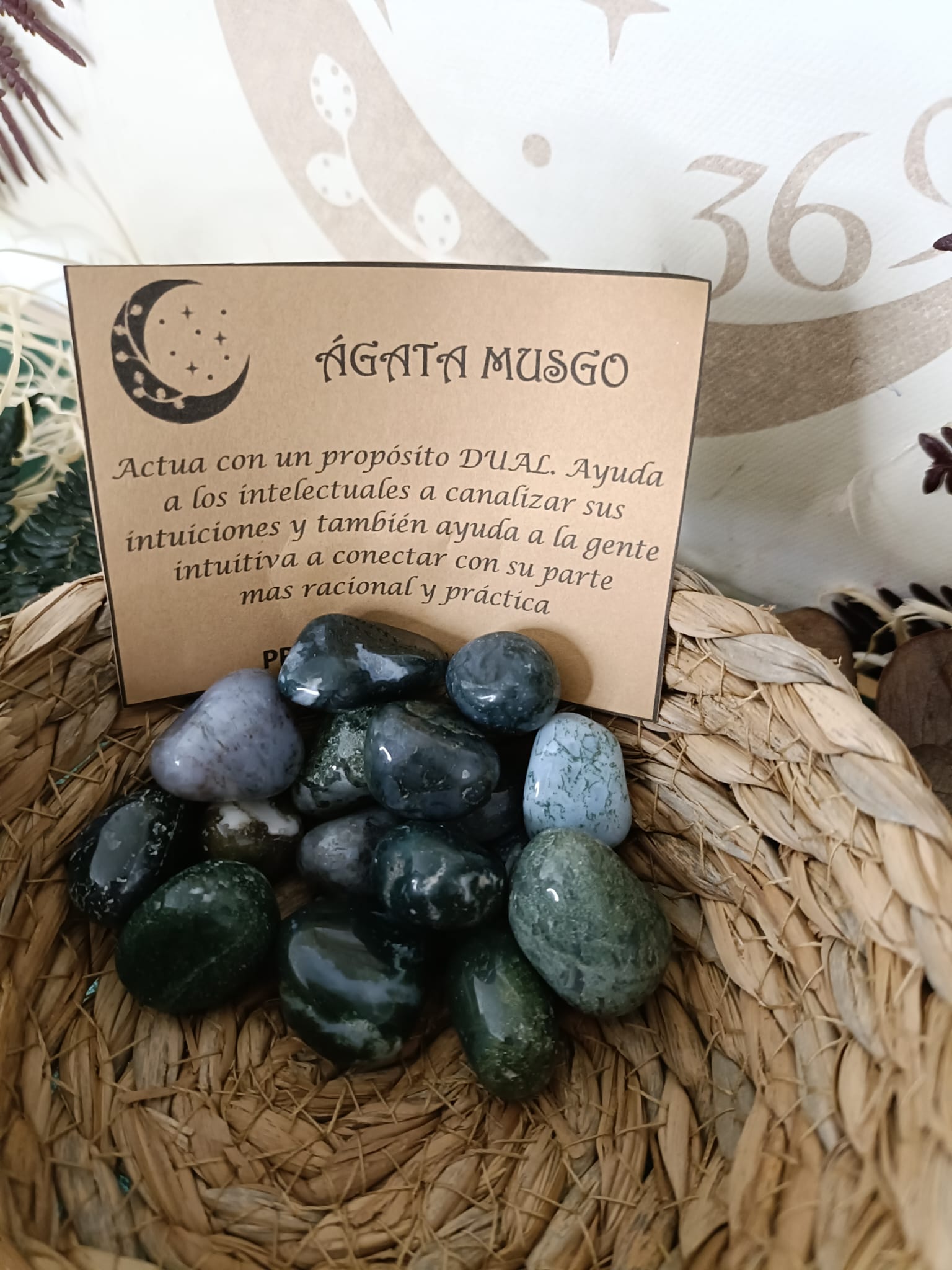 La Ágata Musgo es una piedra natural conocida por su aspecto único, con tonos verdes profundos que recuerdan a la naturaleza misma. Estas piedras, en formato de canto rodado, miden entre 2 y 3 cm, ideales para terapias energéticas, meditación y decoración. La Ágata Musgo se asocia con la calma, el equilibrio emocional y la conexión con la naturaleza.