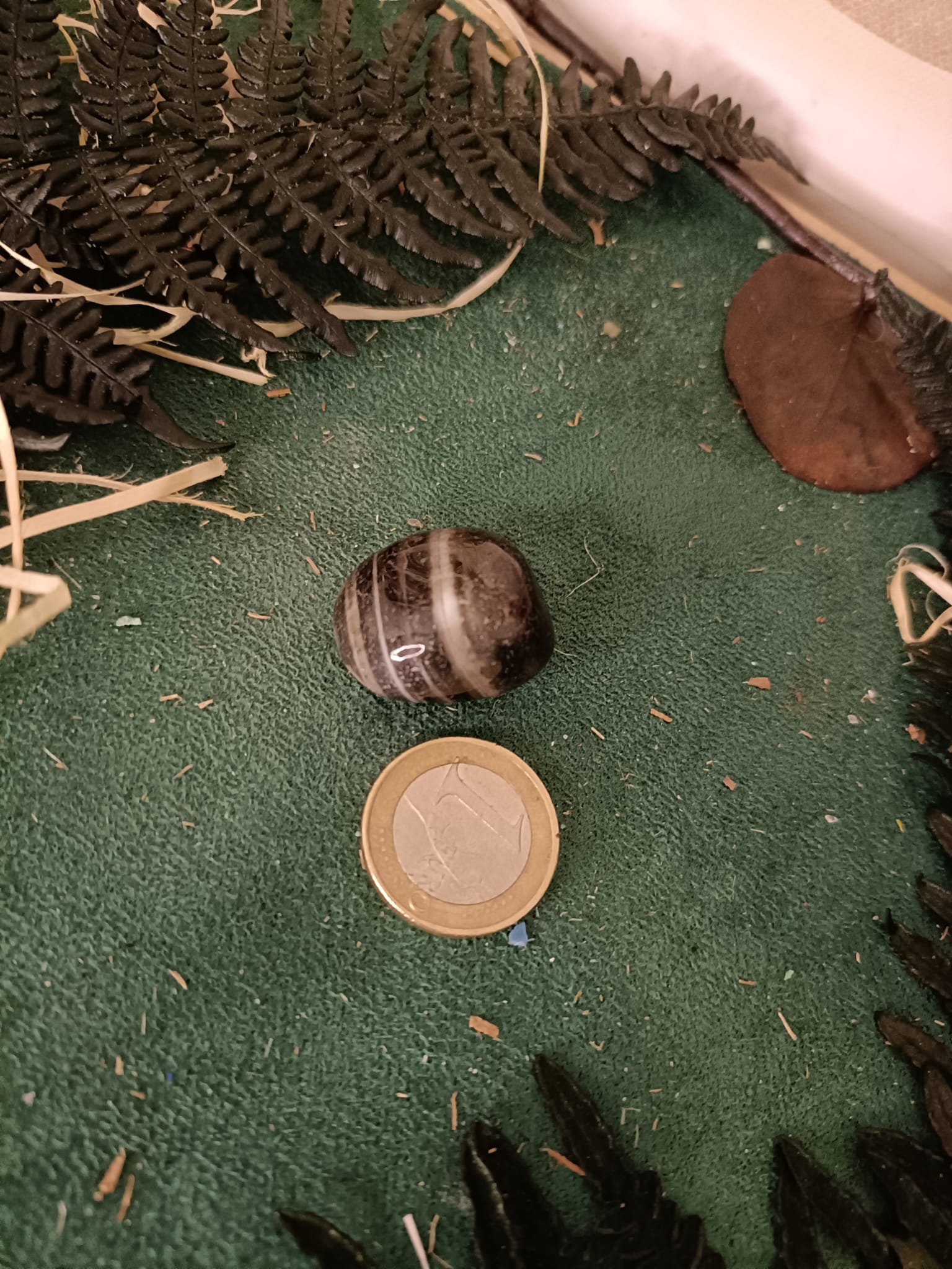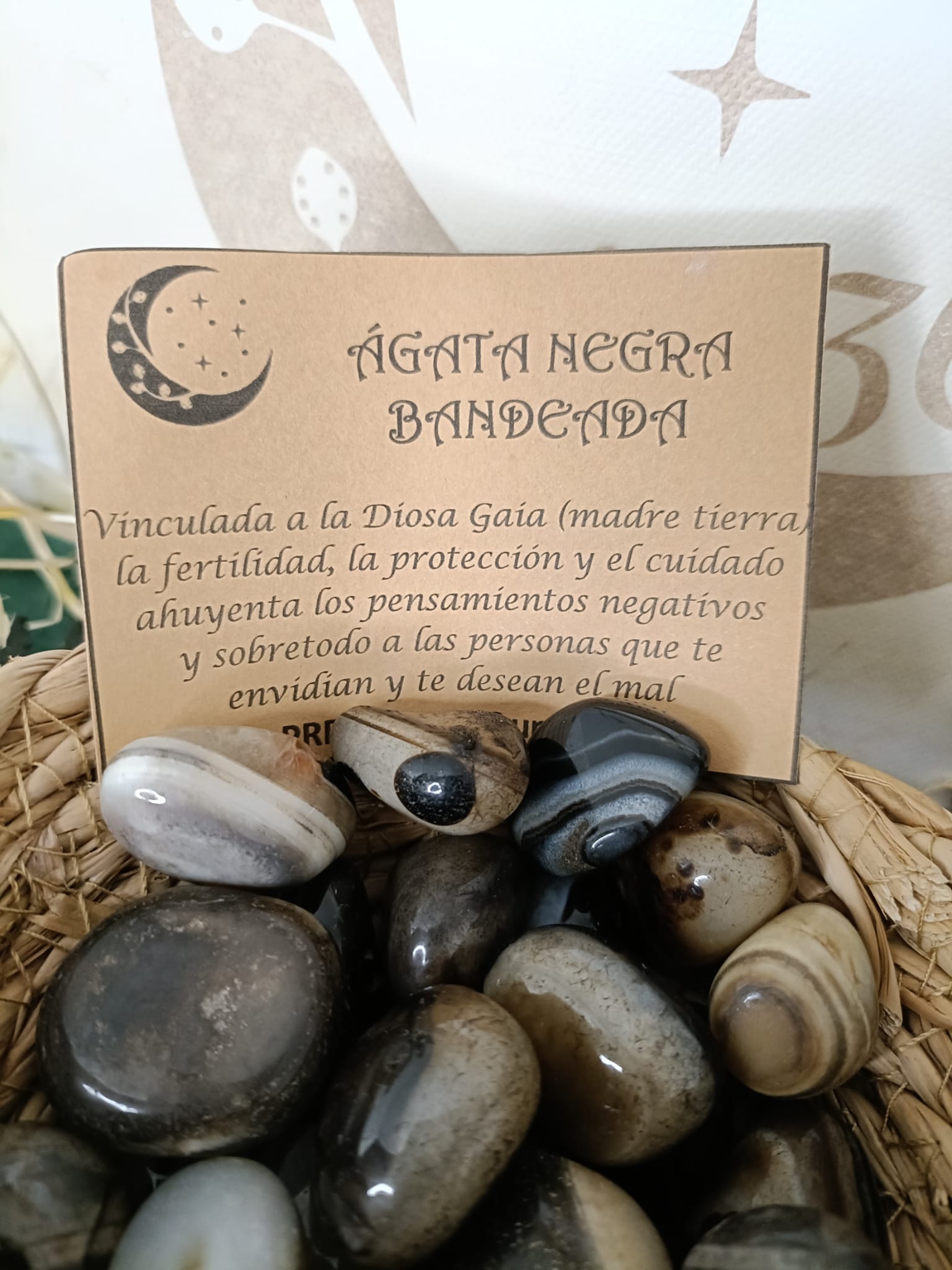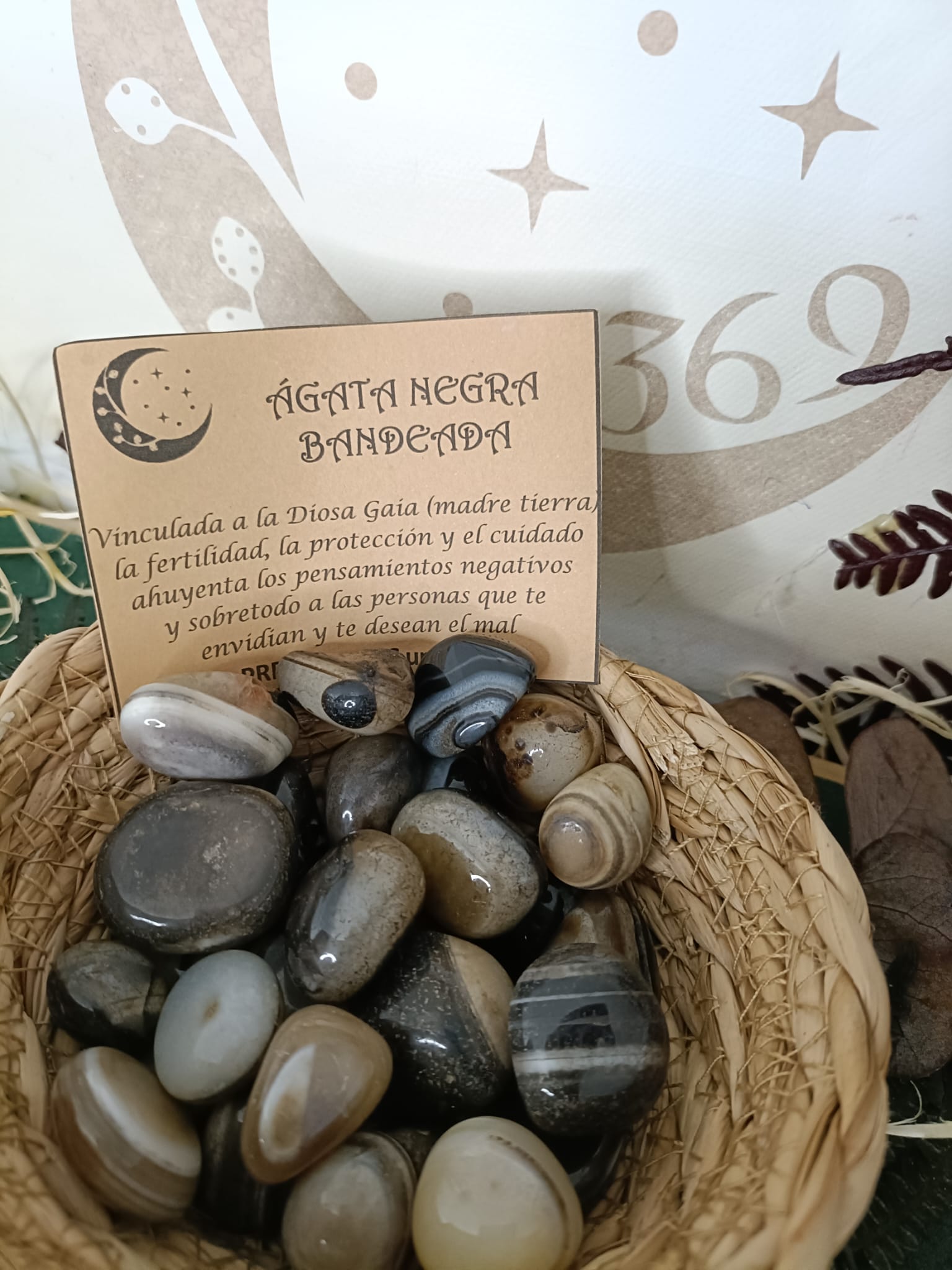 La Ágata Negra Bandeada es una piedra de gran poder protector, asociada a la diosa madre Gaia. Con su energía terrenal, ofrece fertilidad, protección y cuidado, al tiempo que aleja los pensamientos negativos y las malas energías, especialmente aquellas provocadas por la envidia o deseos malintencionados.