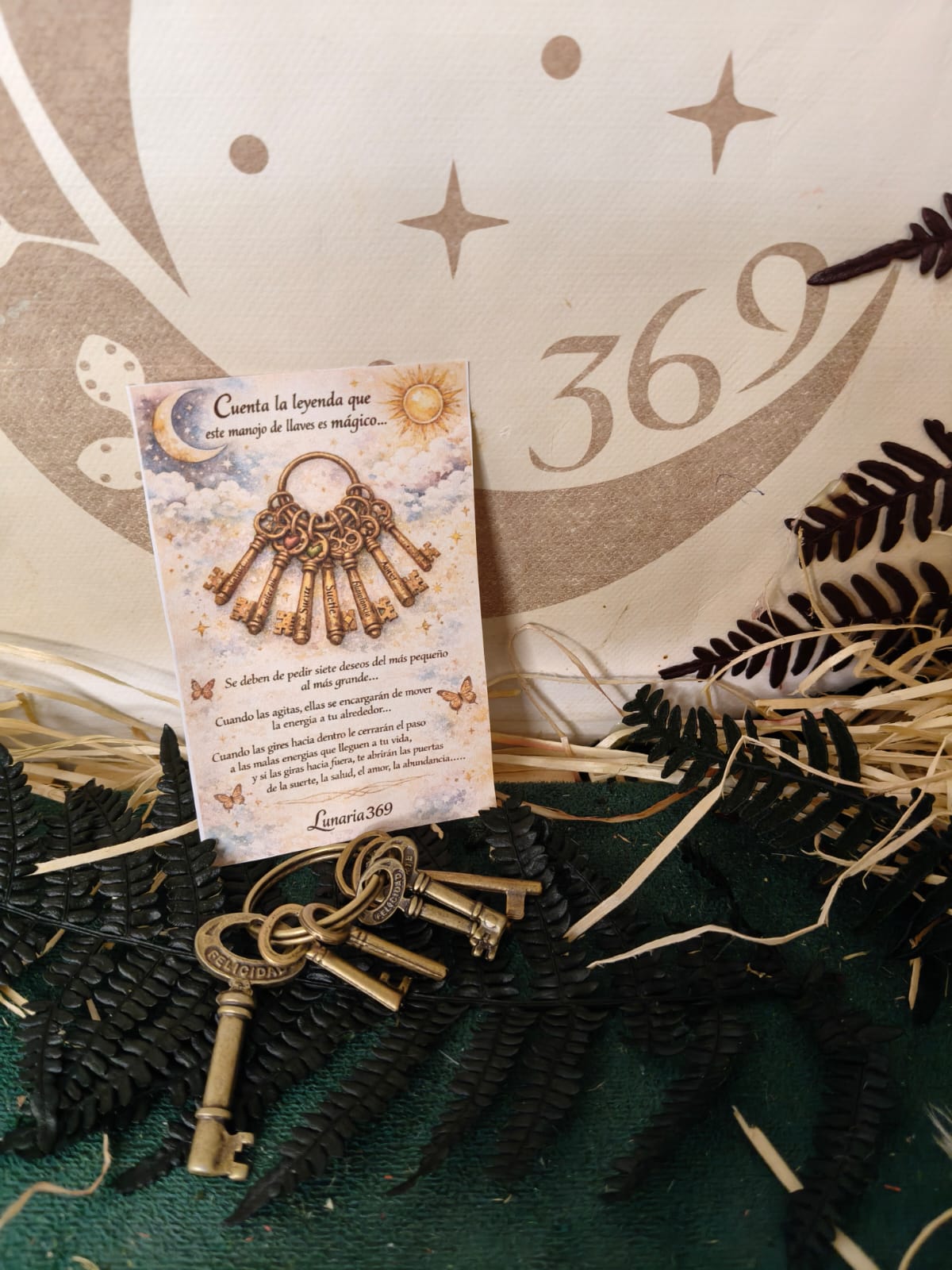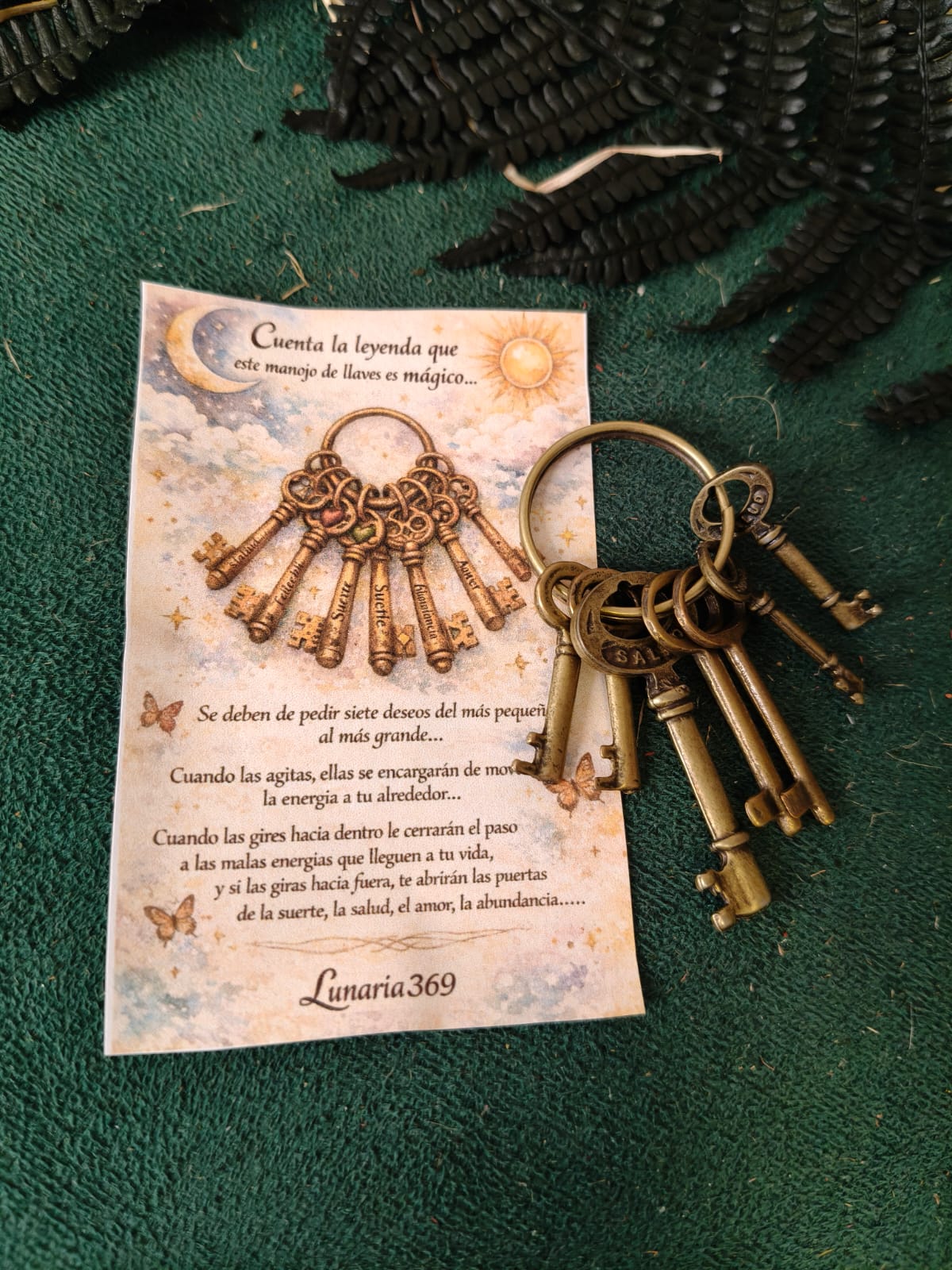 El Amuleto de las 7 Llaves es un poderoso talismán tradicional asociado a la protección, la apertura de caminos y la manifestación de deseos. Está compuesto por siete llaves simbólicas, algunas de ellas grabadas con palabras de poder como salud, felicidad, suerte, amor, abundancia o bienestar, mientras que otras conservan su forma lisa para representar caminos aún por abrir.