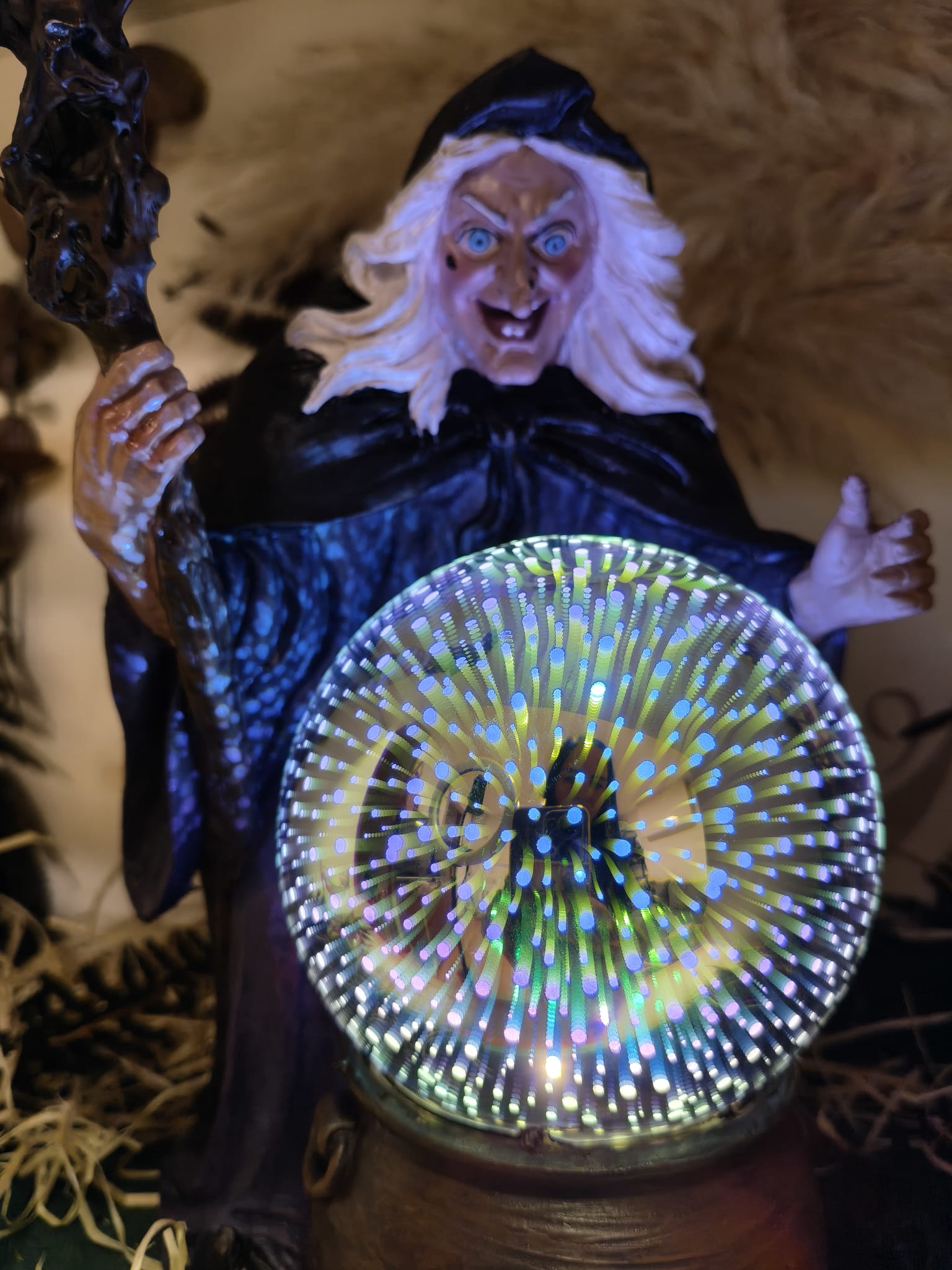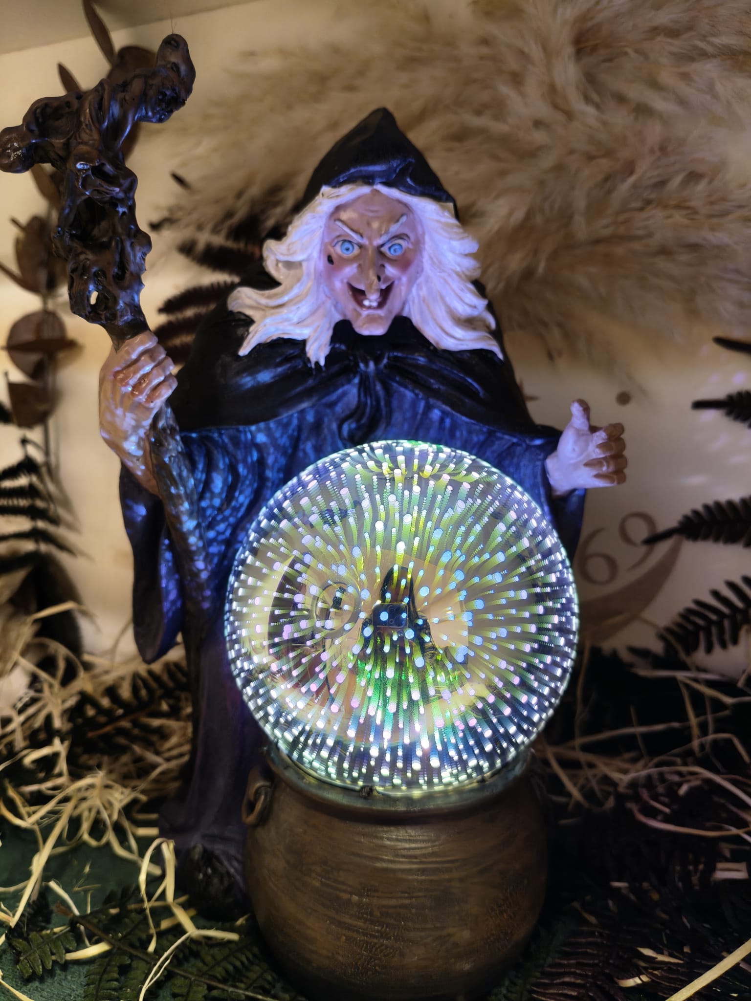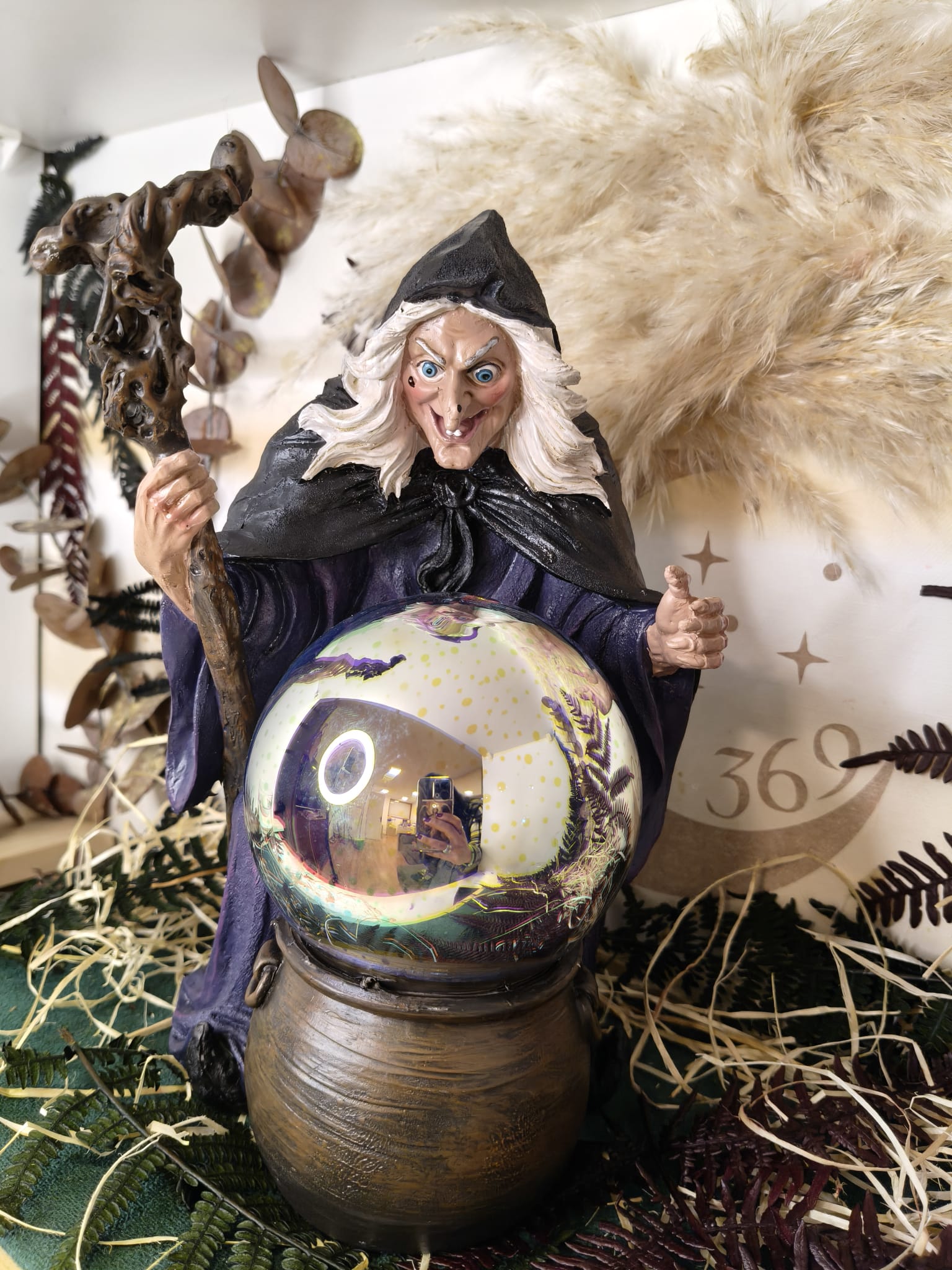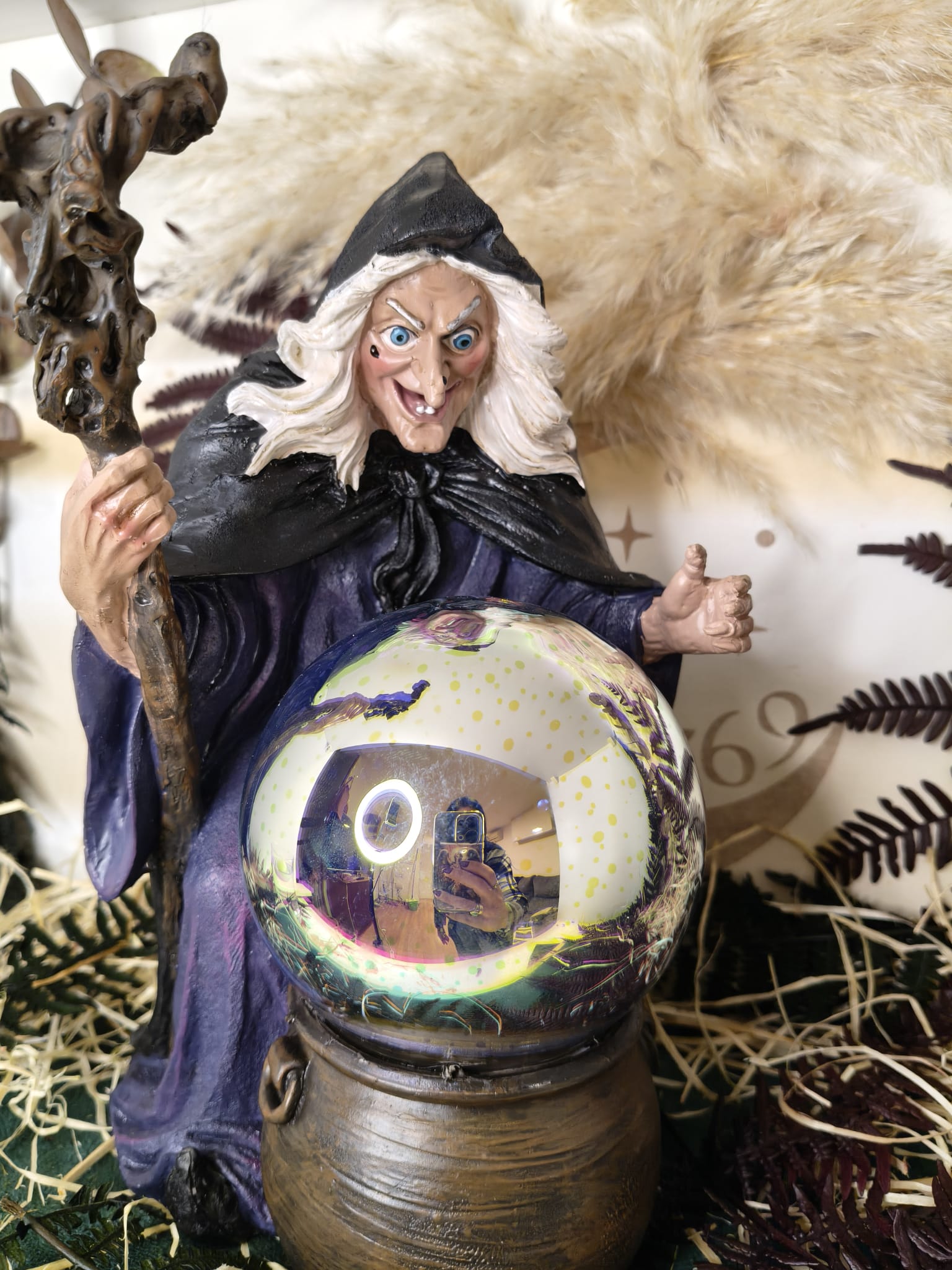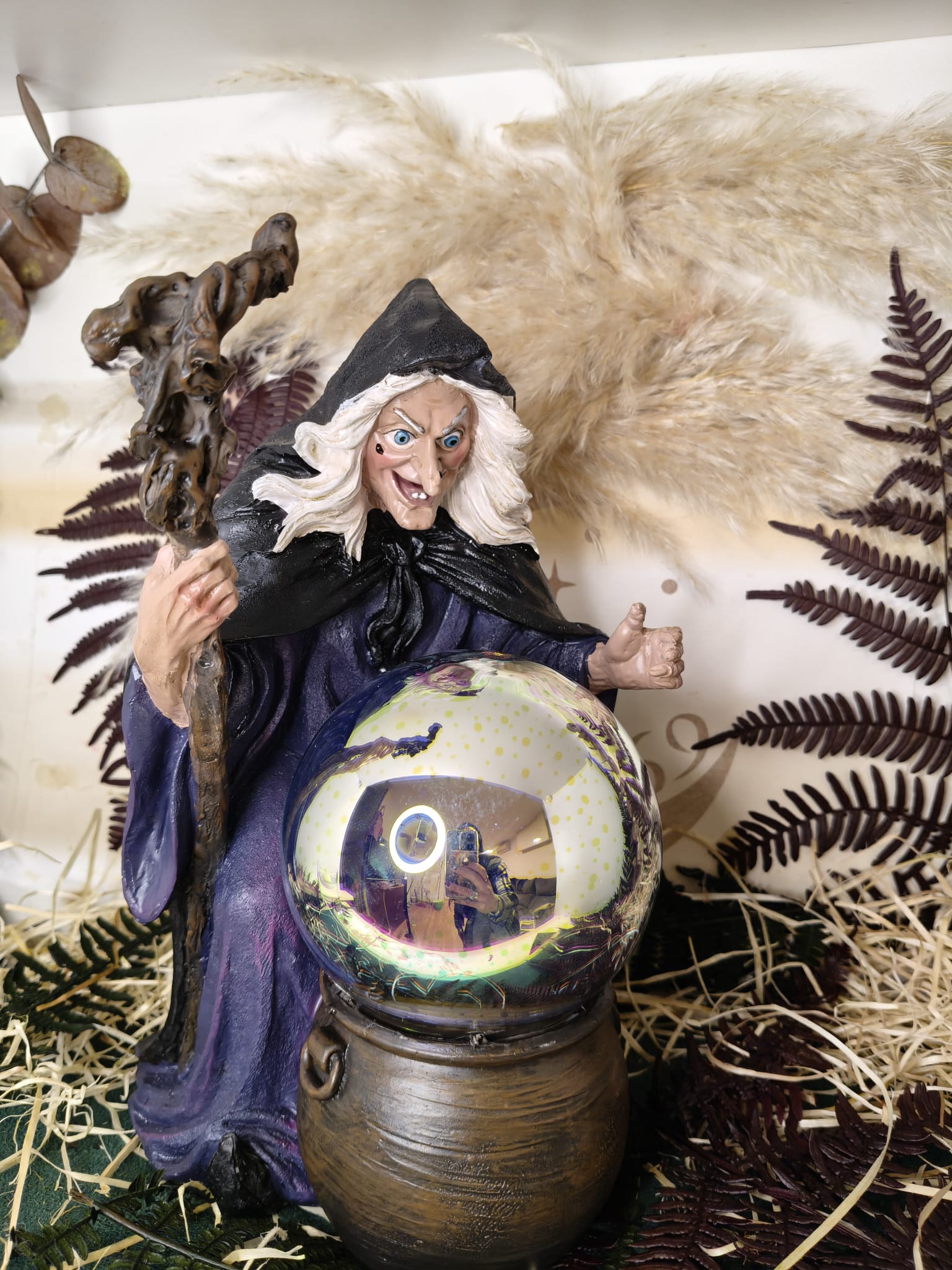 Hecha en resina de alta calidad y pintada a mano, destaca por su realismo y por la espectacular bola de cristal iluminada, que se enciende y llena el espacio de un halo místico y mágico.