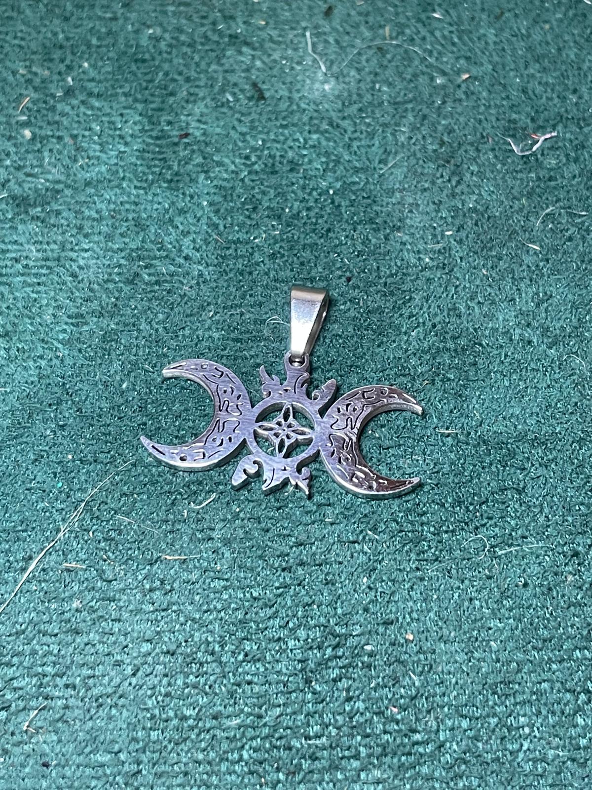 Colgante Esotérico Acero Inoxidable de Nudo de Bruja / Triple Luna. Este colgante esotérico combina dos poderosos símbolos de la espiritualidad y la magia: el Nudo de Bruja y la Triple Luna.
