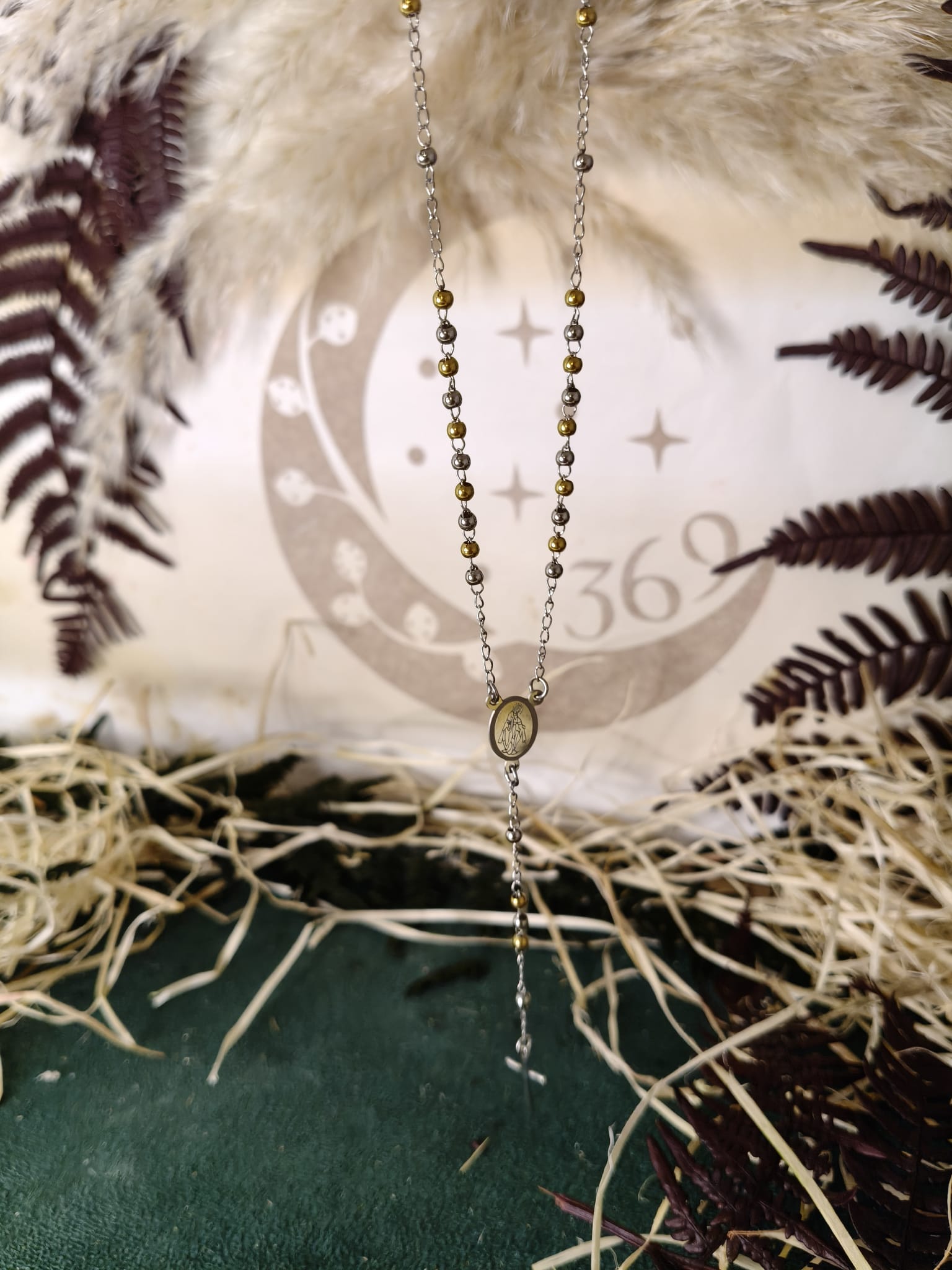 Collar de rosario en acero inoxidable con bolas plateadas y doradas de 3 mm. Largo 60 cm + 10 cm. Elegante, resistente y apto para uso diario. Este Collar de Rosario en Acero Inoxidable combina elegancia y resistencia, ideal para uso diario o como accesorio especial en momentos de oración y meditación.