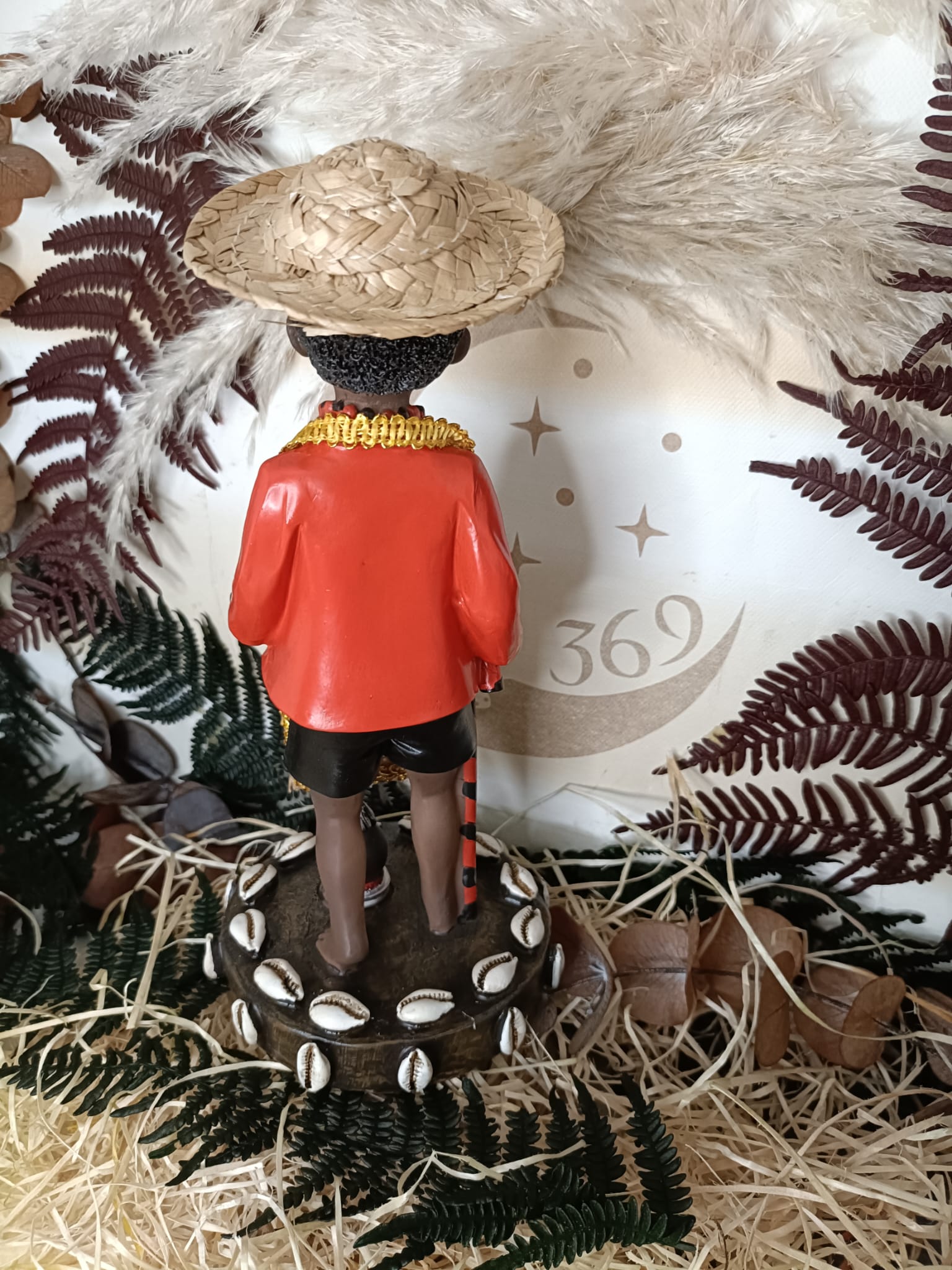 Esta figura de 26 cm, hecha en resina y pintada a mano representa a Elegguá, el orisha guardián de los caminos, las oportunidades y los destinos, en su forma infantil.
