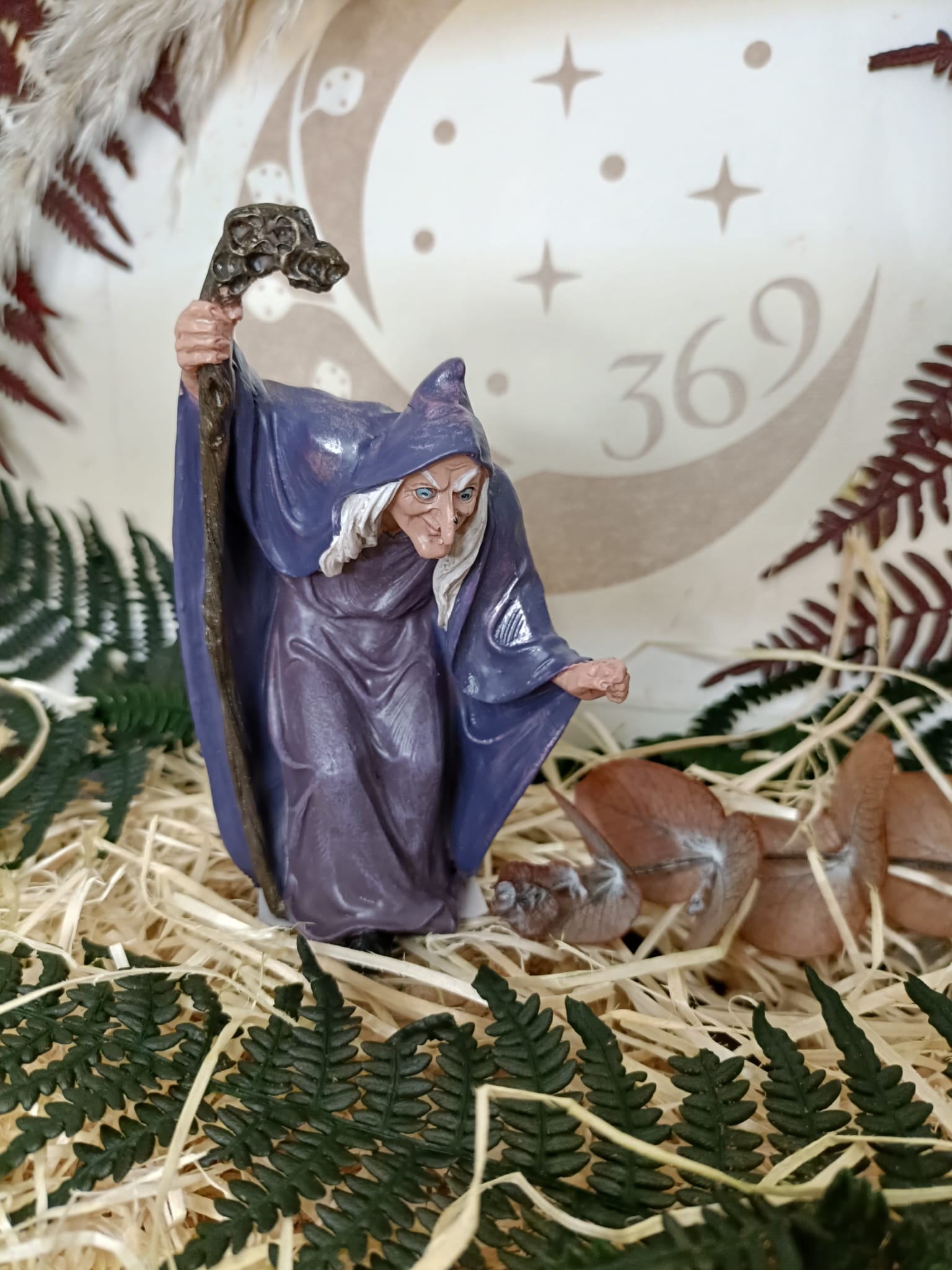 Agrega un toque mágico con esta figura de bruja Morada con vara de 12 cm, elaborada en resina. Perfecta para quienes buscan una pieza esotérica llena de energía y misterio.