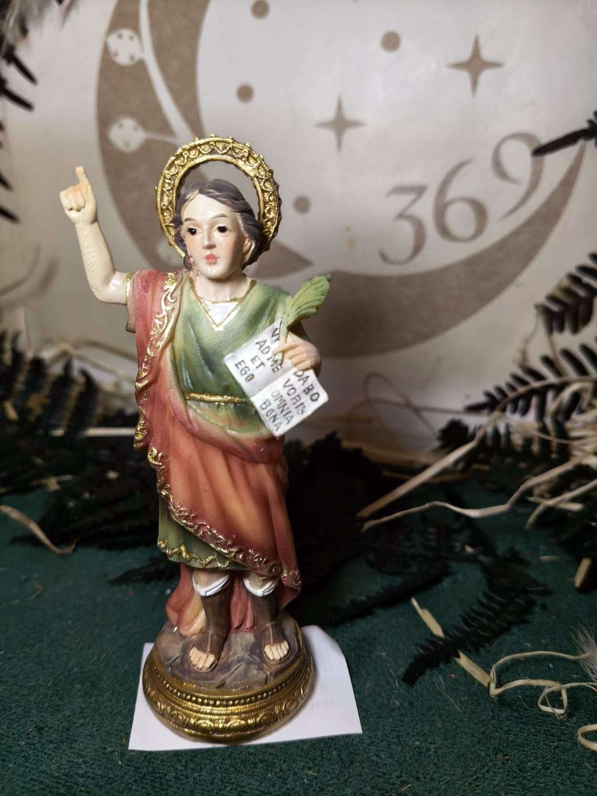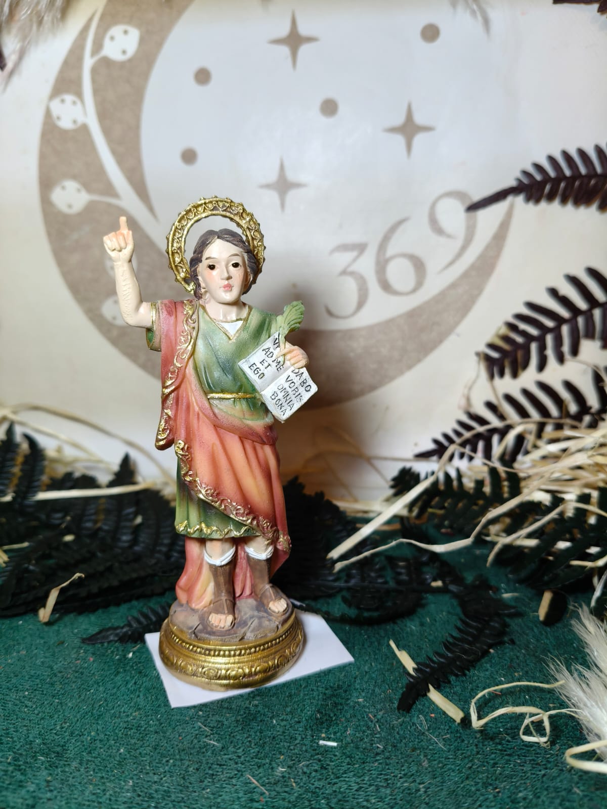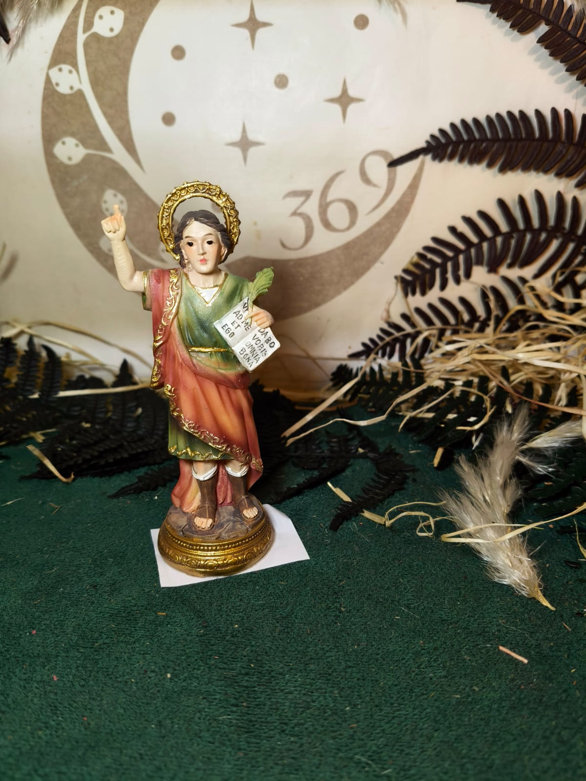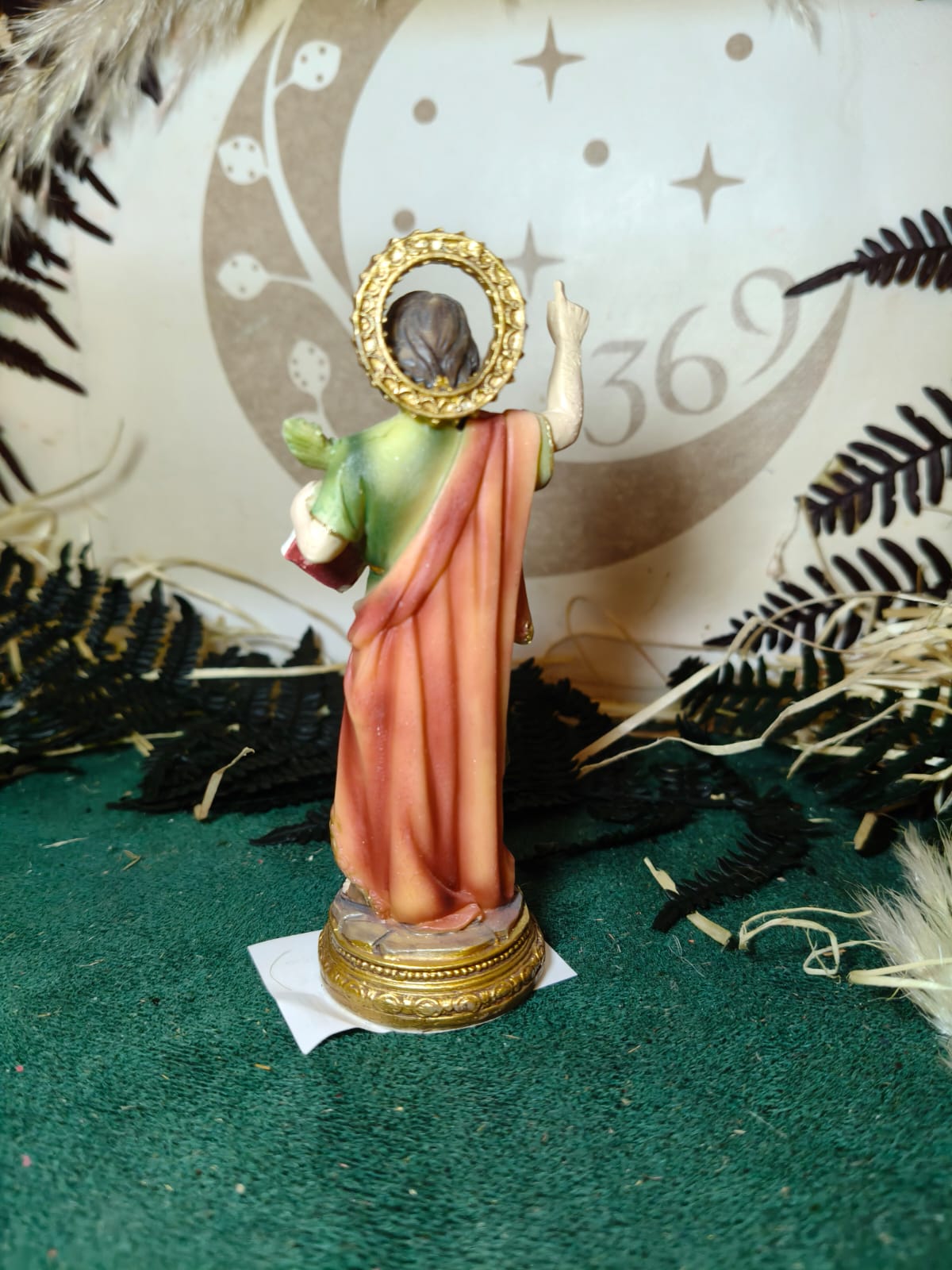 La figura está elaborada en resina de alta calidad, con acabados detallados y una expresión serena que transmite confianza y protección.