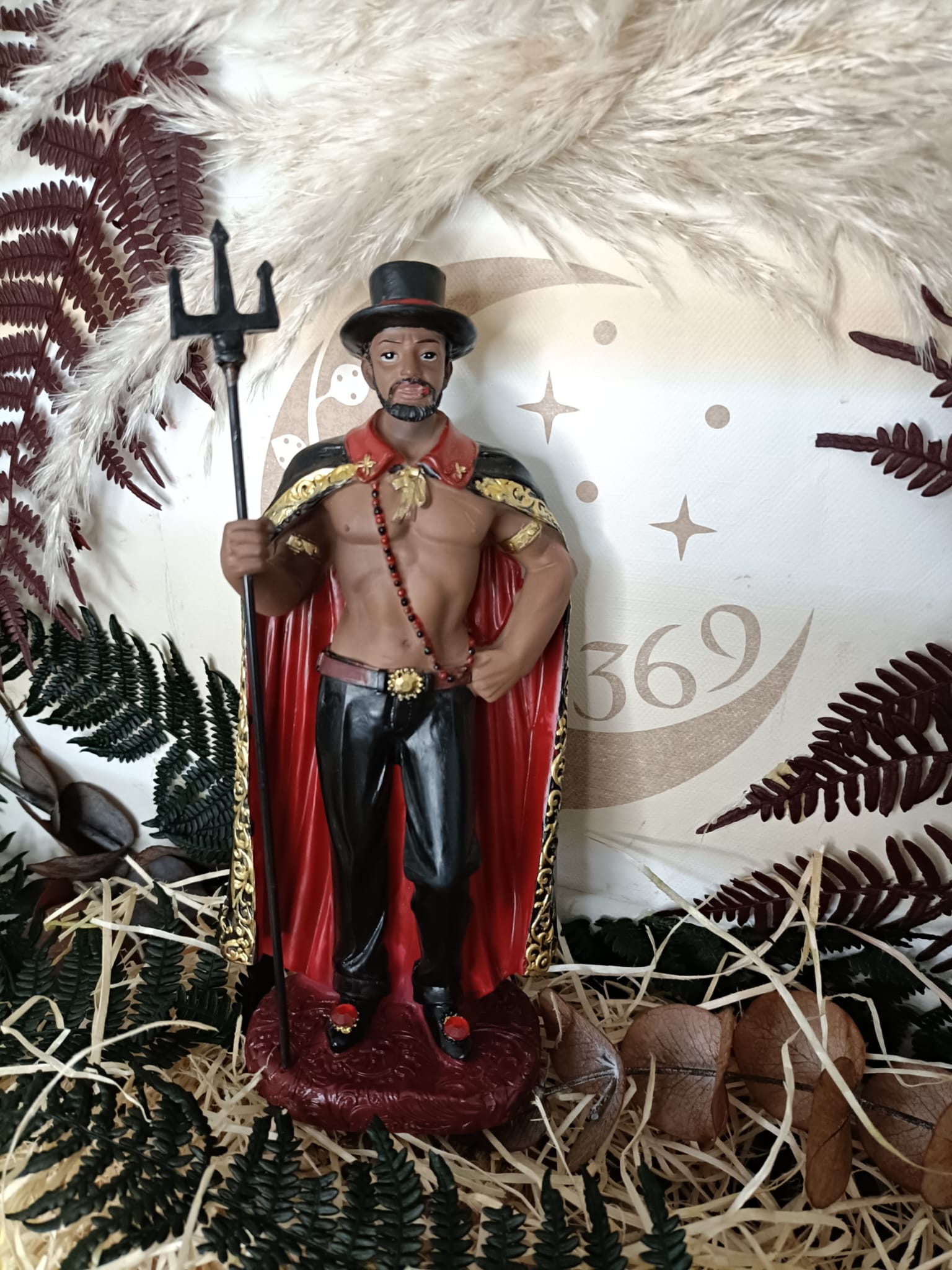 Ideal para: Devotos de Exú, seguidores de la tradición yoruba, trabajos espirituales de transformación, protección y conexión con los espíritus La figura de Exú es perfecta para quienes buscan transformación, protección y guiar sus destinos a través de la energía de Exú, el que todo lo ve y está en todas partes. Su tamaño de 21 cm hace de esta figura una pieza imponente para tu altar esotérico o como elemento decorativo cargado de un profundo simbolismo espiritual.