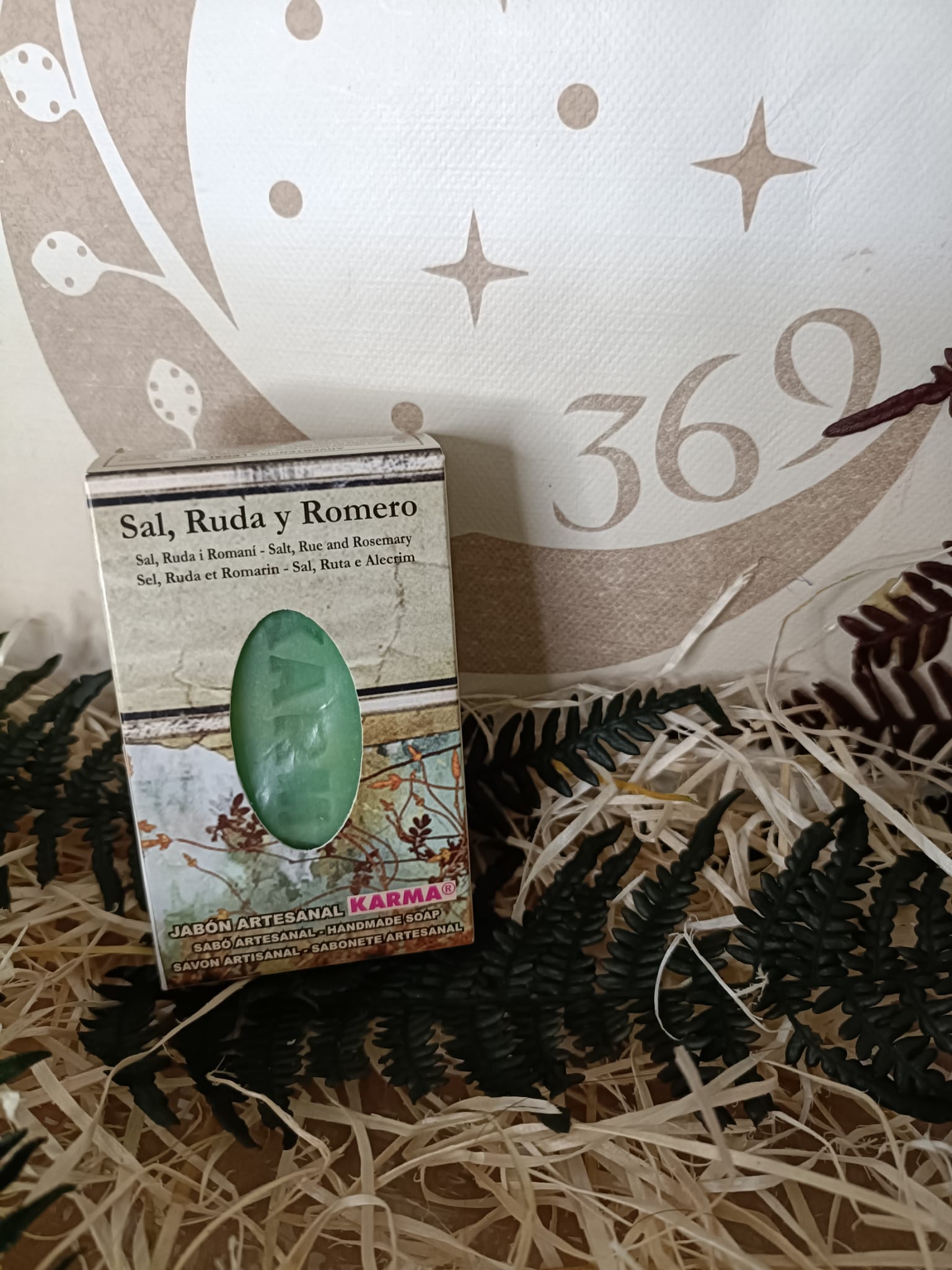 Realiza una limpieza energética completa con el Jabón de Sal, Ruda y Romero, disponible en Lunaria369, Sanxenxo.