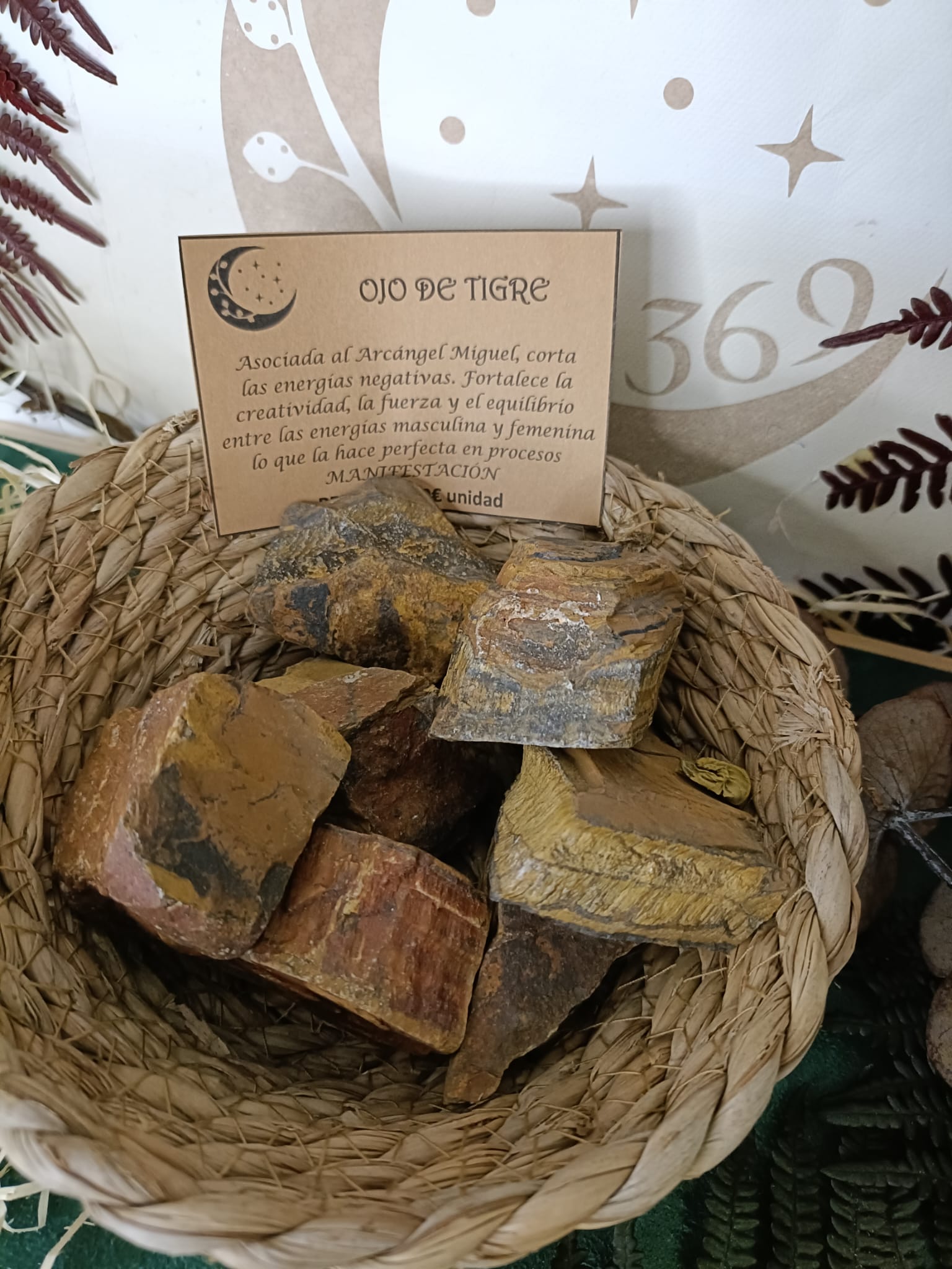 Propiedades energéticas: El ojo de tigre se asocia con la protección, la confianza personal y el fortalecimiento de la intuición. Es un cristal que combina energía de tierra y sol, ofreciendo equilibrio y fuerza.