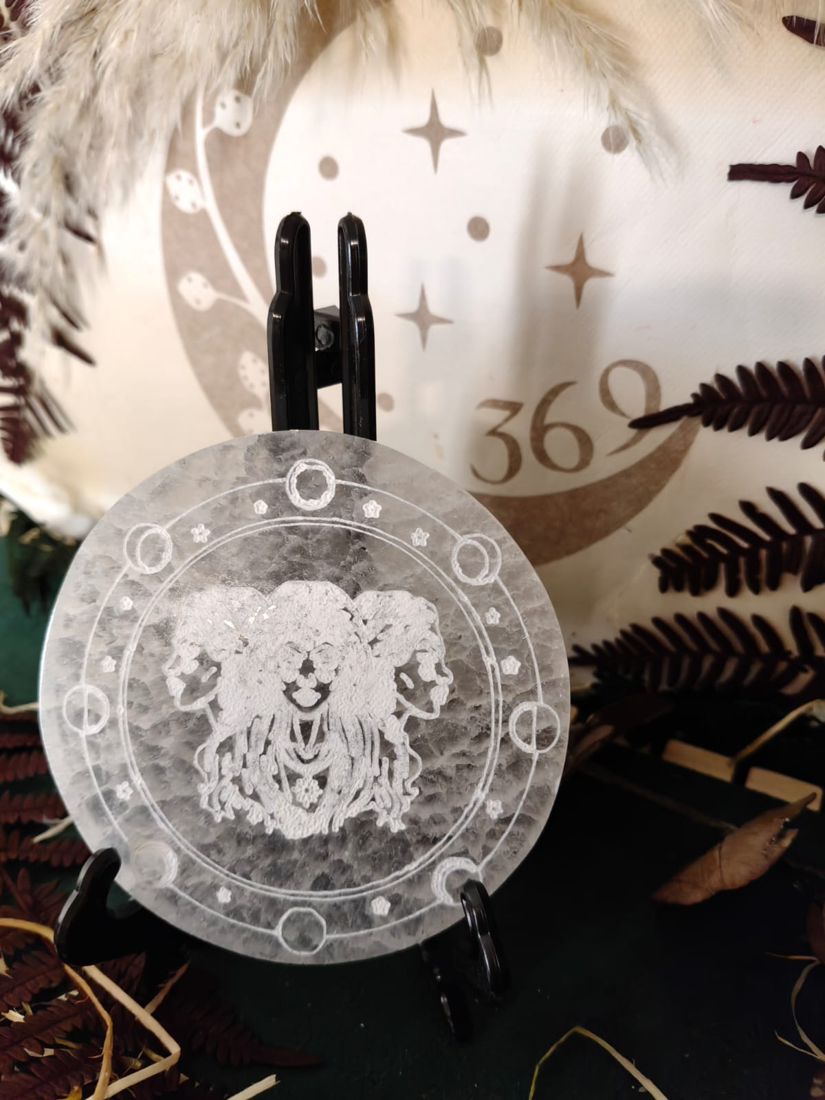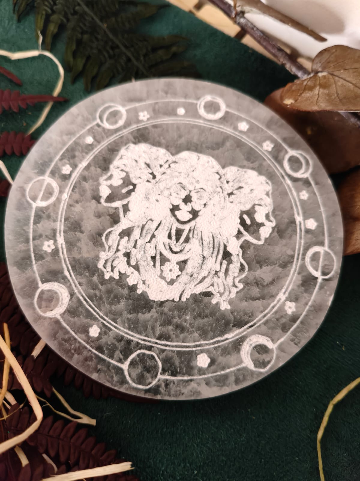 🌙 Placa de Selenita 10 cm Diosa Hécate con Fase Lunar – Energía, Protección y Magia. Conecta con la poderosa energía de la Diosa Hécate y las fases lunares gracias a esta Placa de Selenita de 10 cm. Perfecta para rituales, meditación y decoración espiritual.
