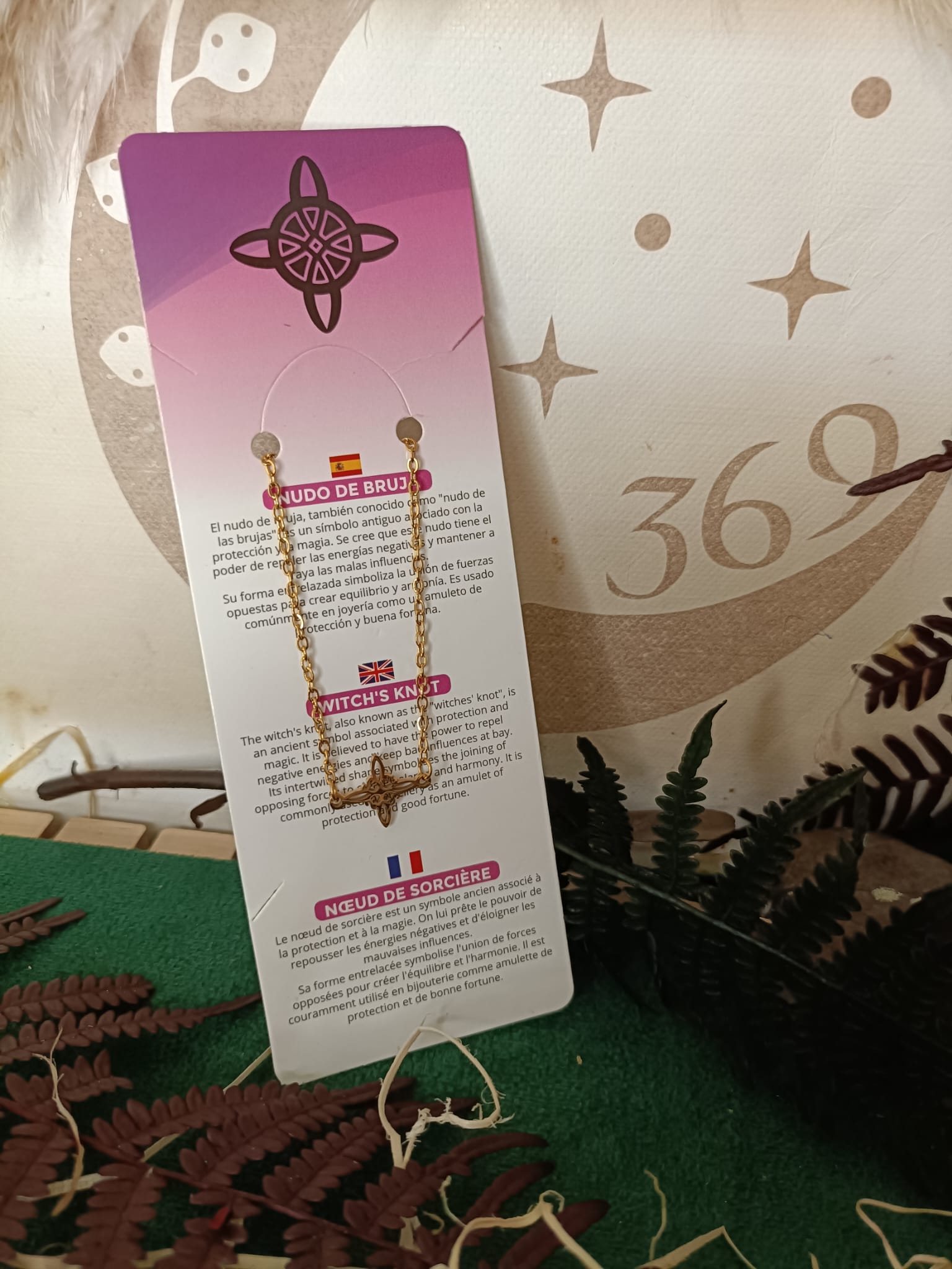 🔗 Pulsera Amuleto Nudo de Bruja – Acero Dorado (16+4 cm) ✨ Lleva contigo la sabiduría ancestral de las brujas con esta elegante pulsera de acero inoxidable dorado, adornada con un potente amuleto esotérico: el Nudo de Bruja.