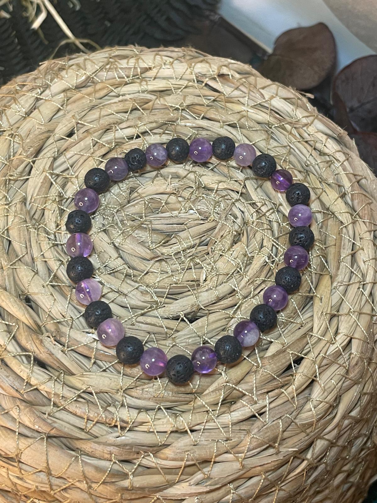 Energía y Equilibrio Espiritual. La Pulsera de Lava y Amatista combina las propiedades únicas de dos poderosas piedras naturales para ayudarte a equilibrar cuerpo, mente y espíritu. Esta pulsera está formada por cuentas de piedra de lava y amatista de aproximadamente 6 mm, ideales para llevar energía positiva contigo en todo momento.