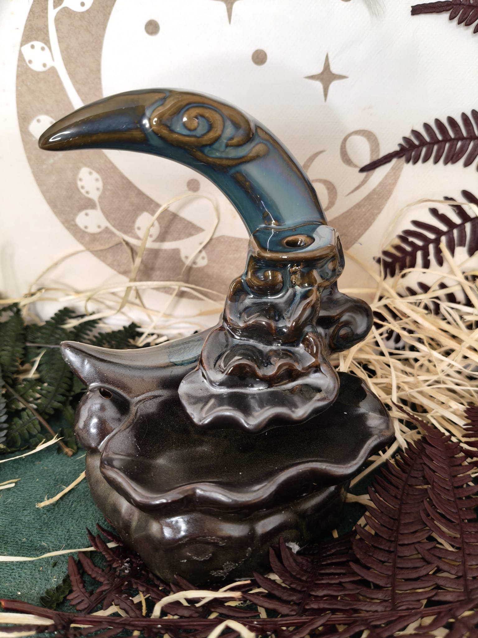 Quemador de incienso de reflujo con diseño de luna, tamaño aproximado 13×9 cm. Ideal para aromaterapia, meditación y crear ambientes relajantes y protectores. Crea un ambiente mágico y relajante con este quemador de incienso de reflujo con diseño de luna, con unas dimensiones aproximadas de 13×9 cm. Perfecto para usar conos de incienso de reflujo, permite que el humo descienda en forma de cascada, aportando un efecto visual hipnótico mientras purifica el espacio y favorece la meditación.
