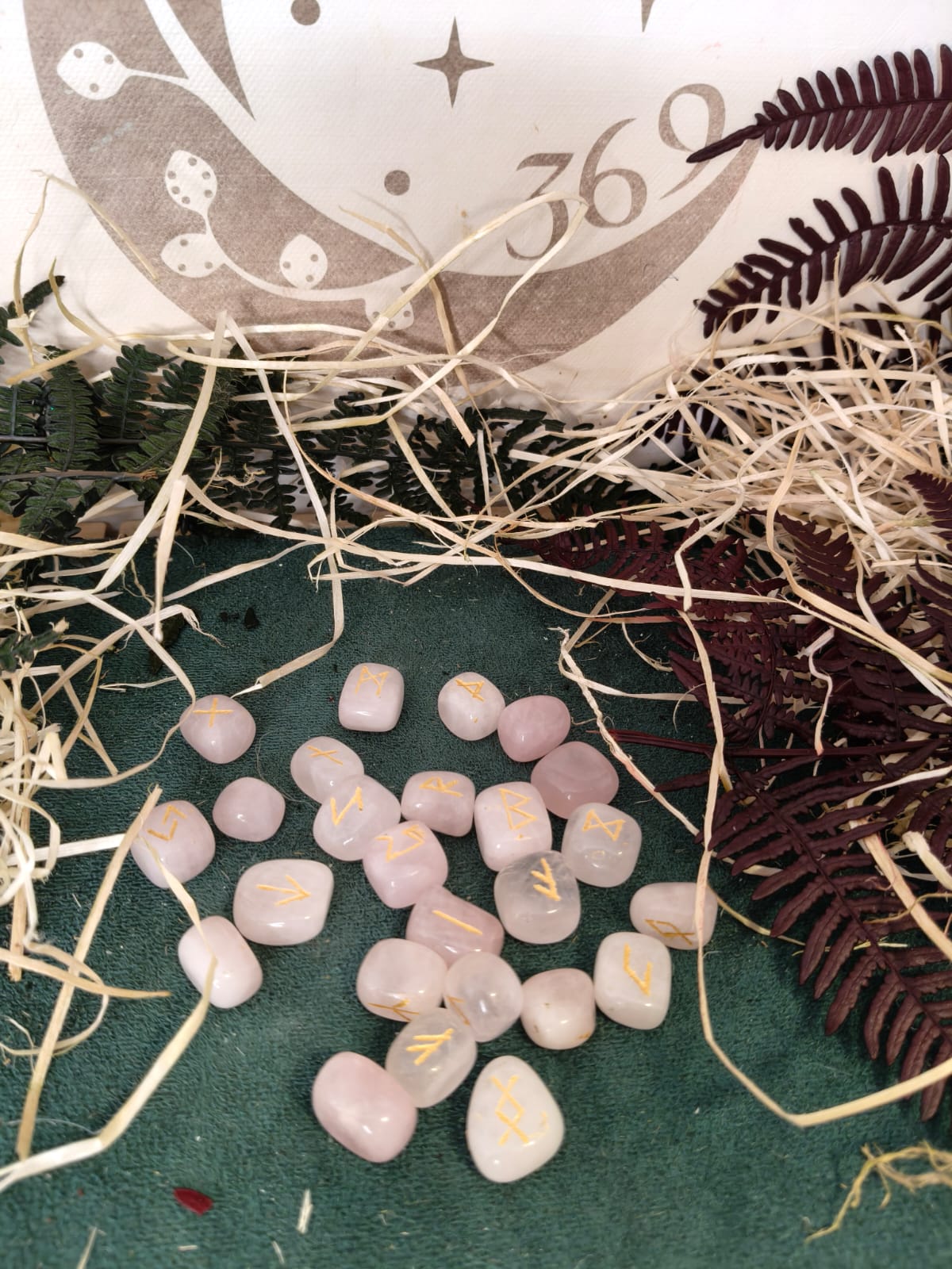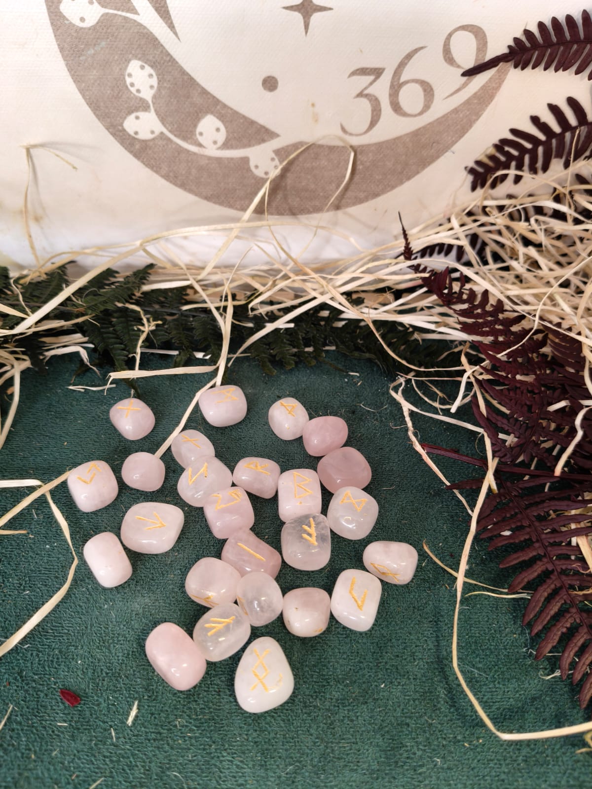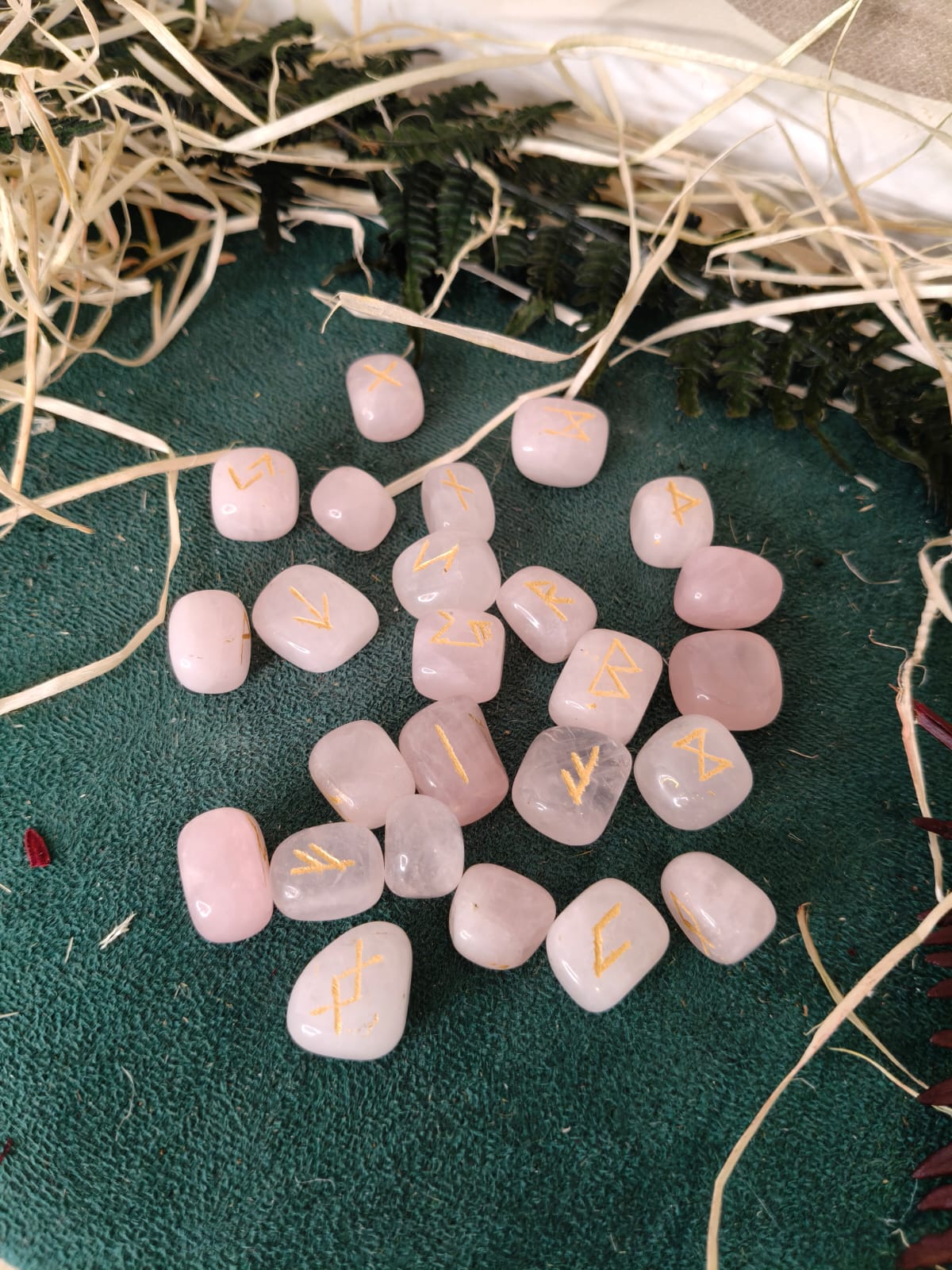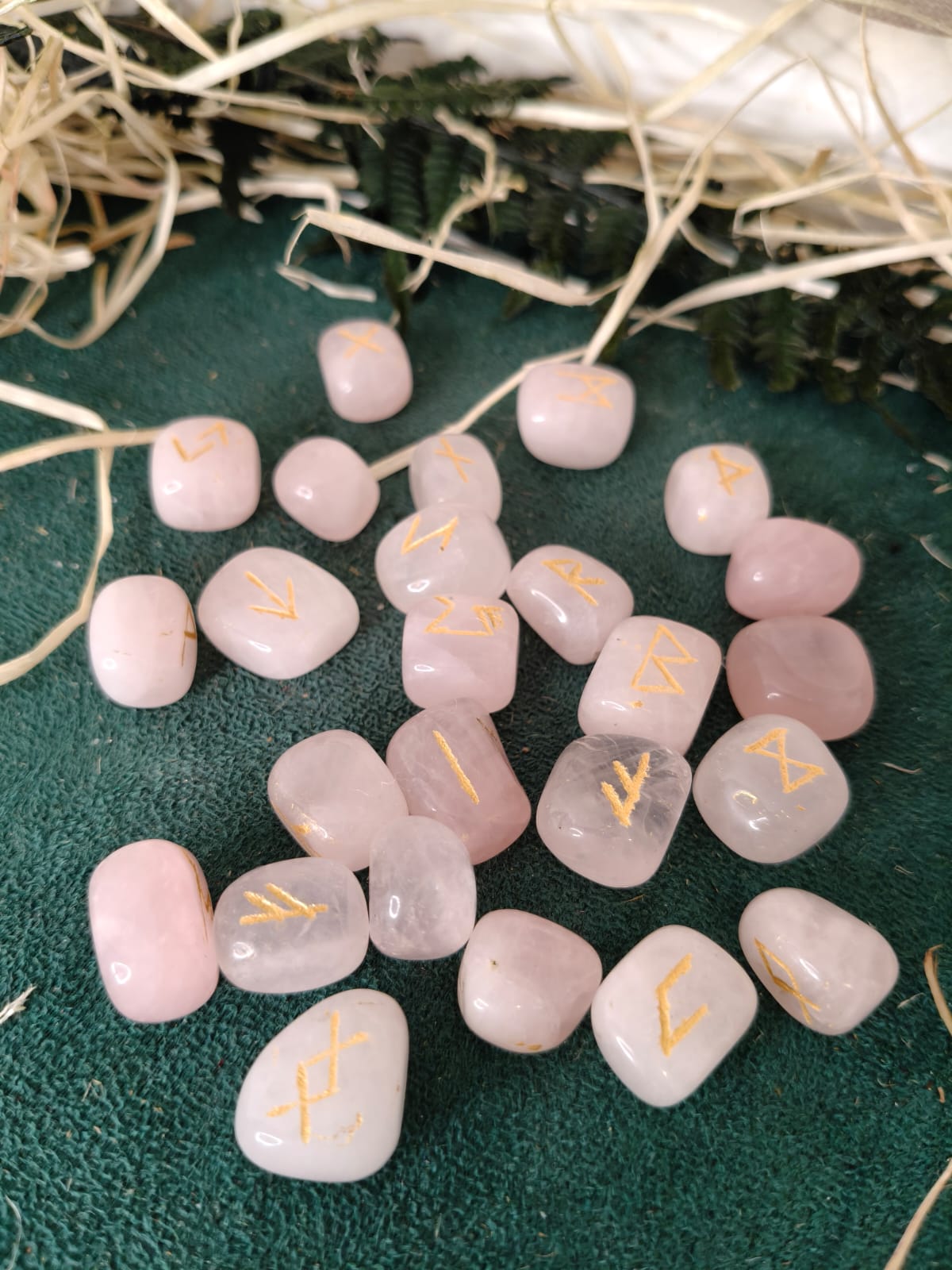 Runas talladas en cuarzo rosa, piedra de amor, paz y armonía.