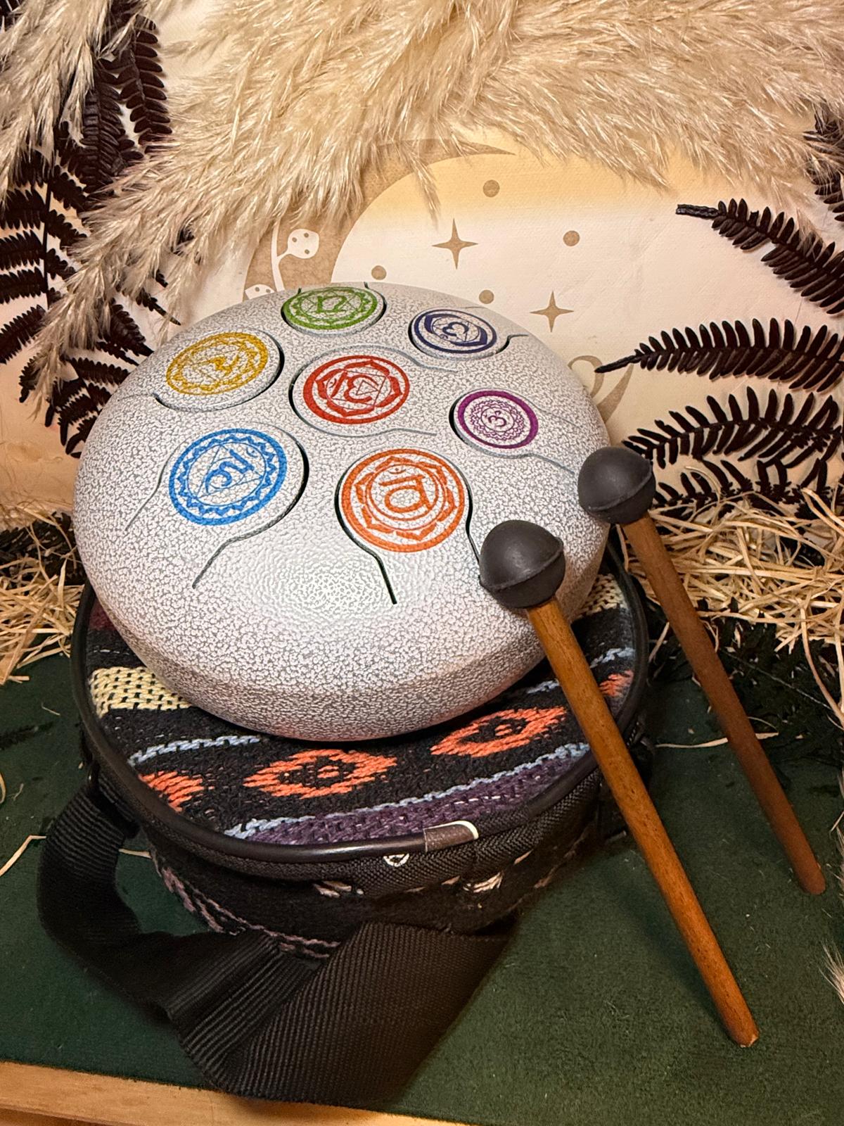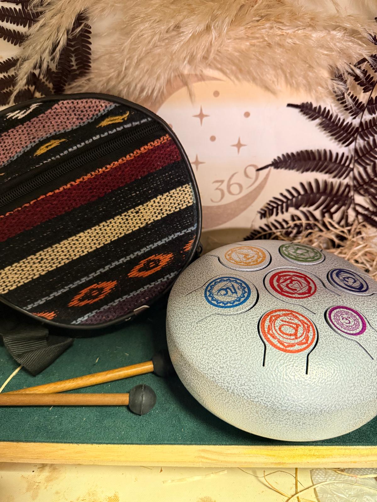 Tambor metálico de lengüetas de 17 cm afinado en 7 chakras con funda y baquetas incluidas para meditación, relajación y sanación sonora.