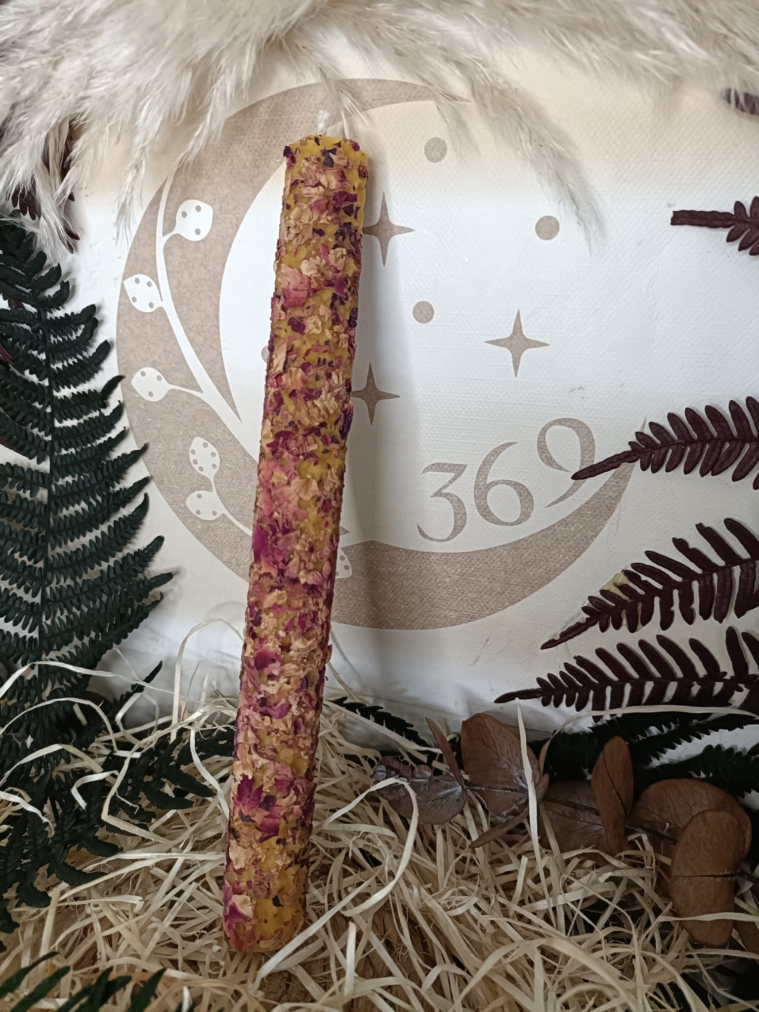 Esta vela artesanal está elaborada con miel natural y adornada con pétalos de rosa, creando una experiencia única para tus rituales de amor, atracción y bienestar. Con un tamaño de 20 x 2 cm, es perfecta para crear un ambiente acogedor y armonioso en tu hogar o espacio sagrado.