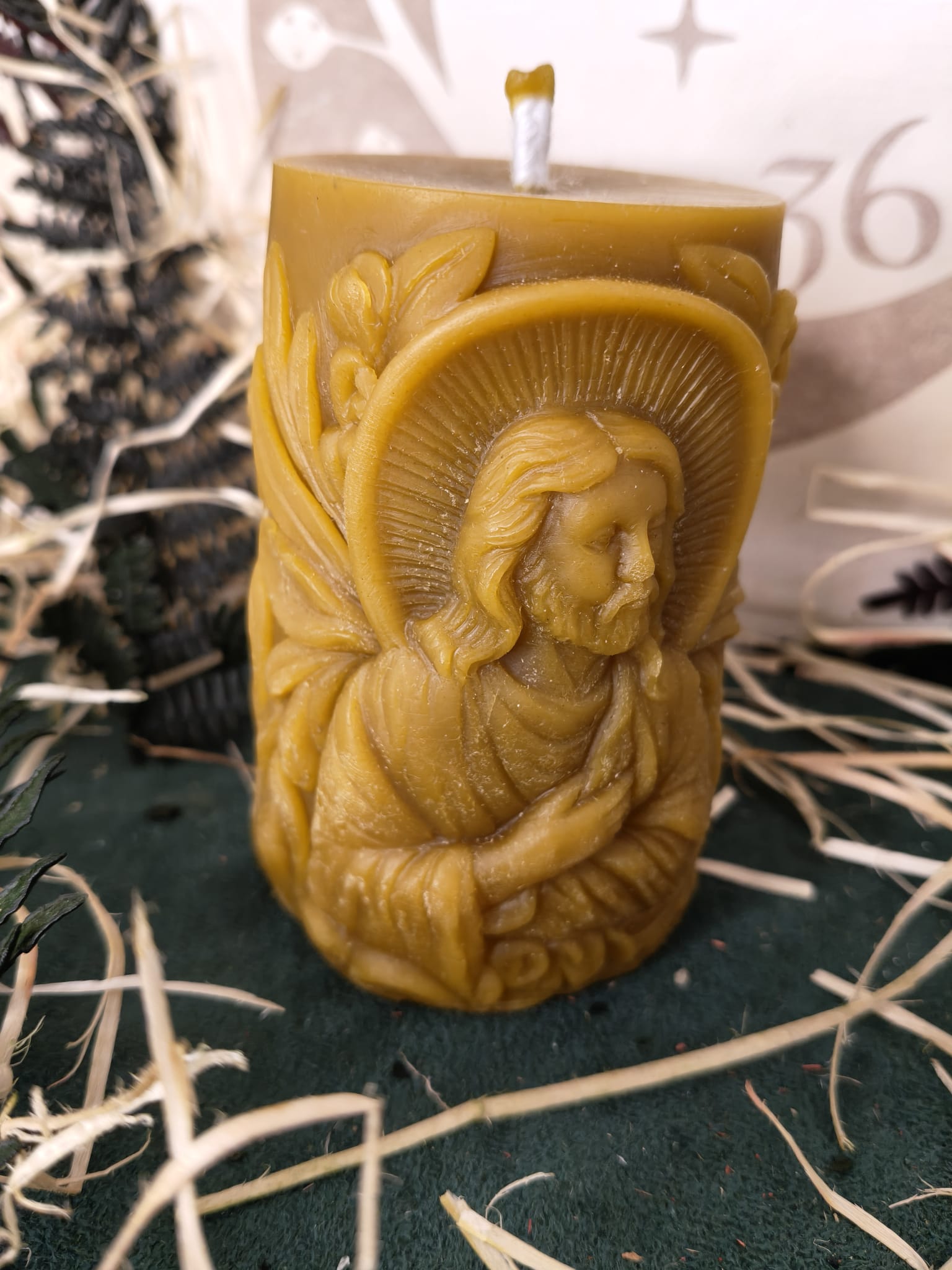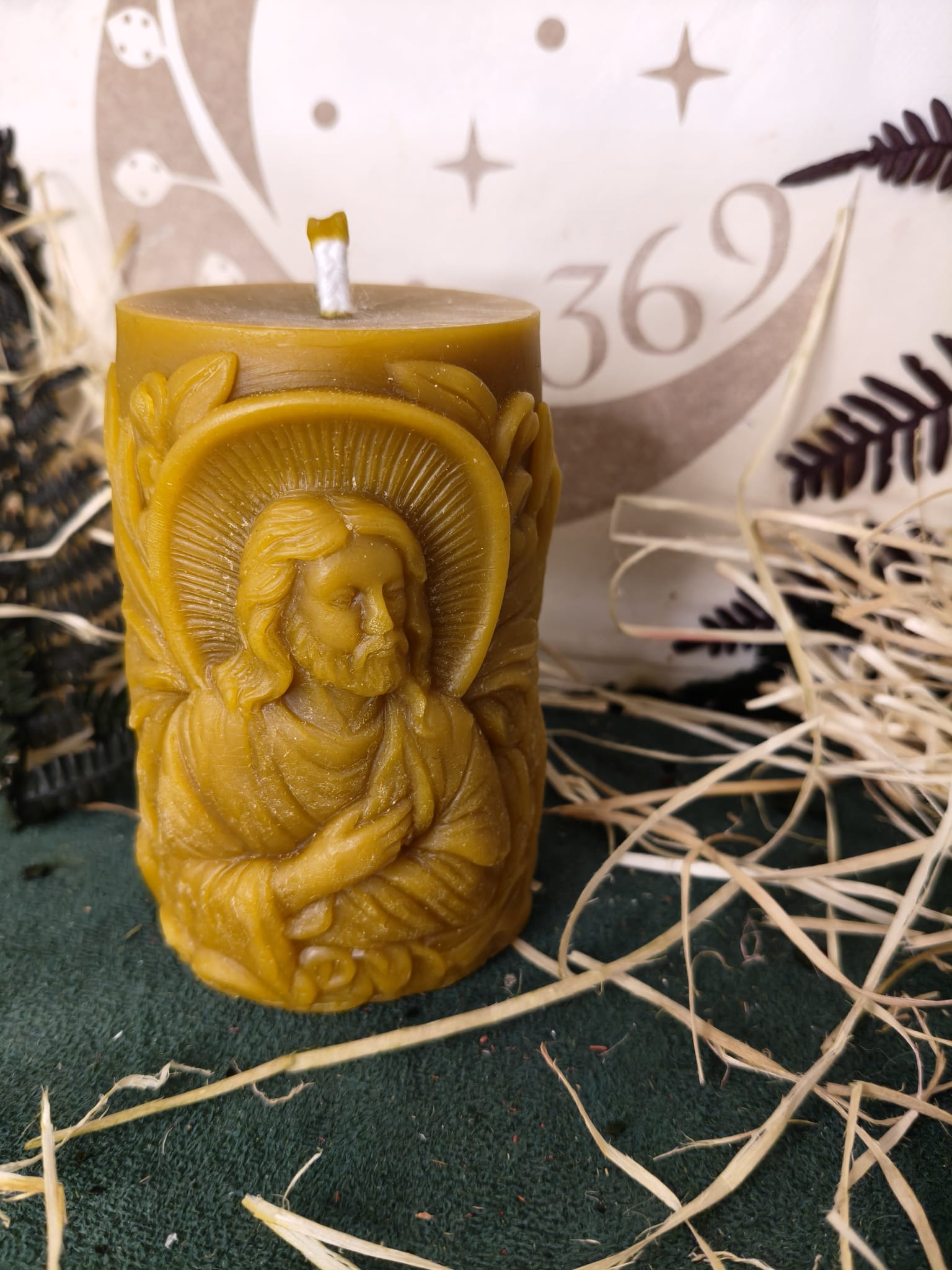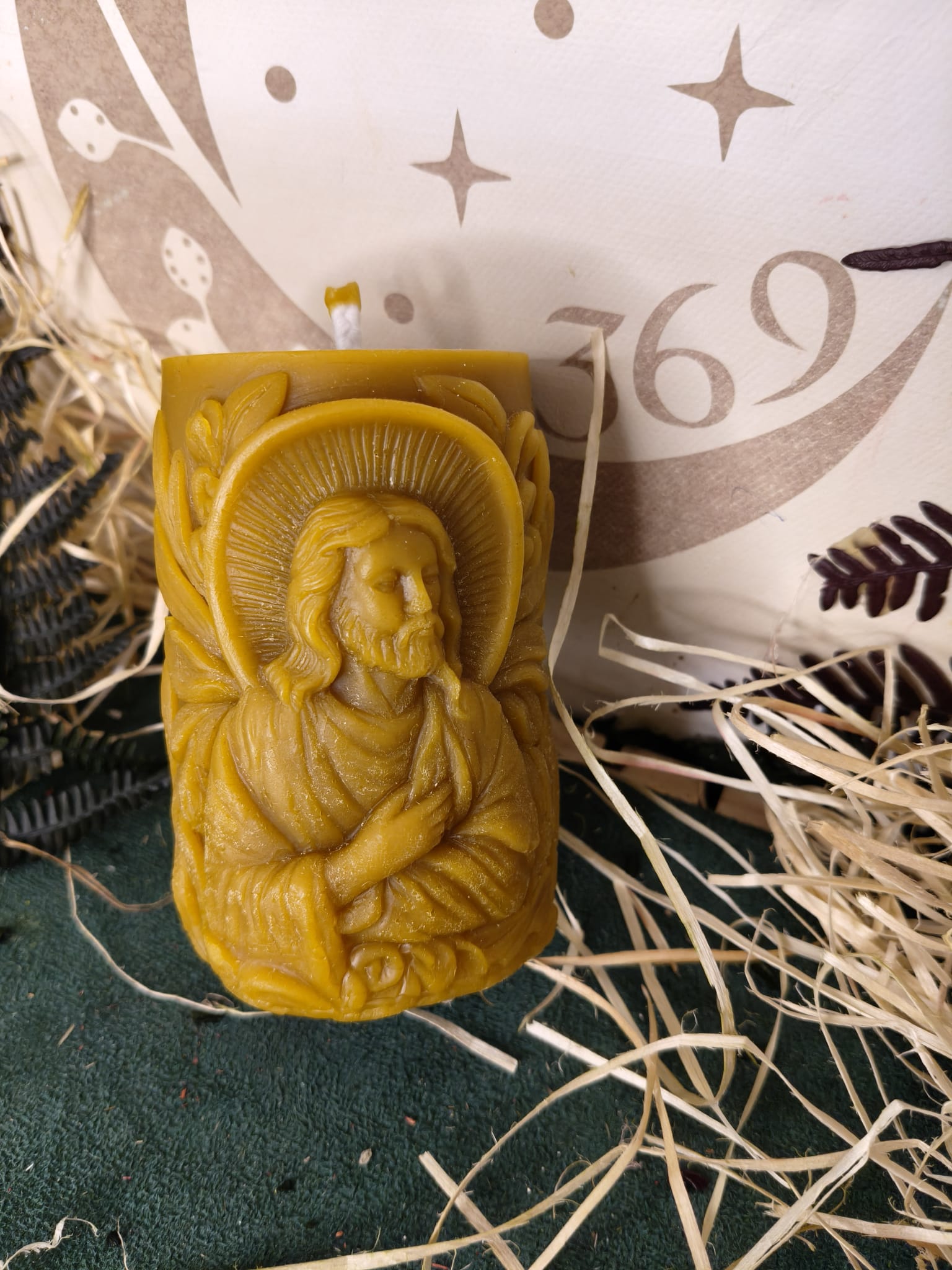 Velón tipo cirio artesanal, elaborado con cera de miel 100% natural e hilo de algodón, con la imagen de Jesús grabada en relieve. Cada pieza está hecha a mano, lo que le confiere un carácter único y una energía pura y elevada.